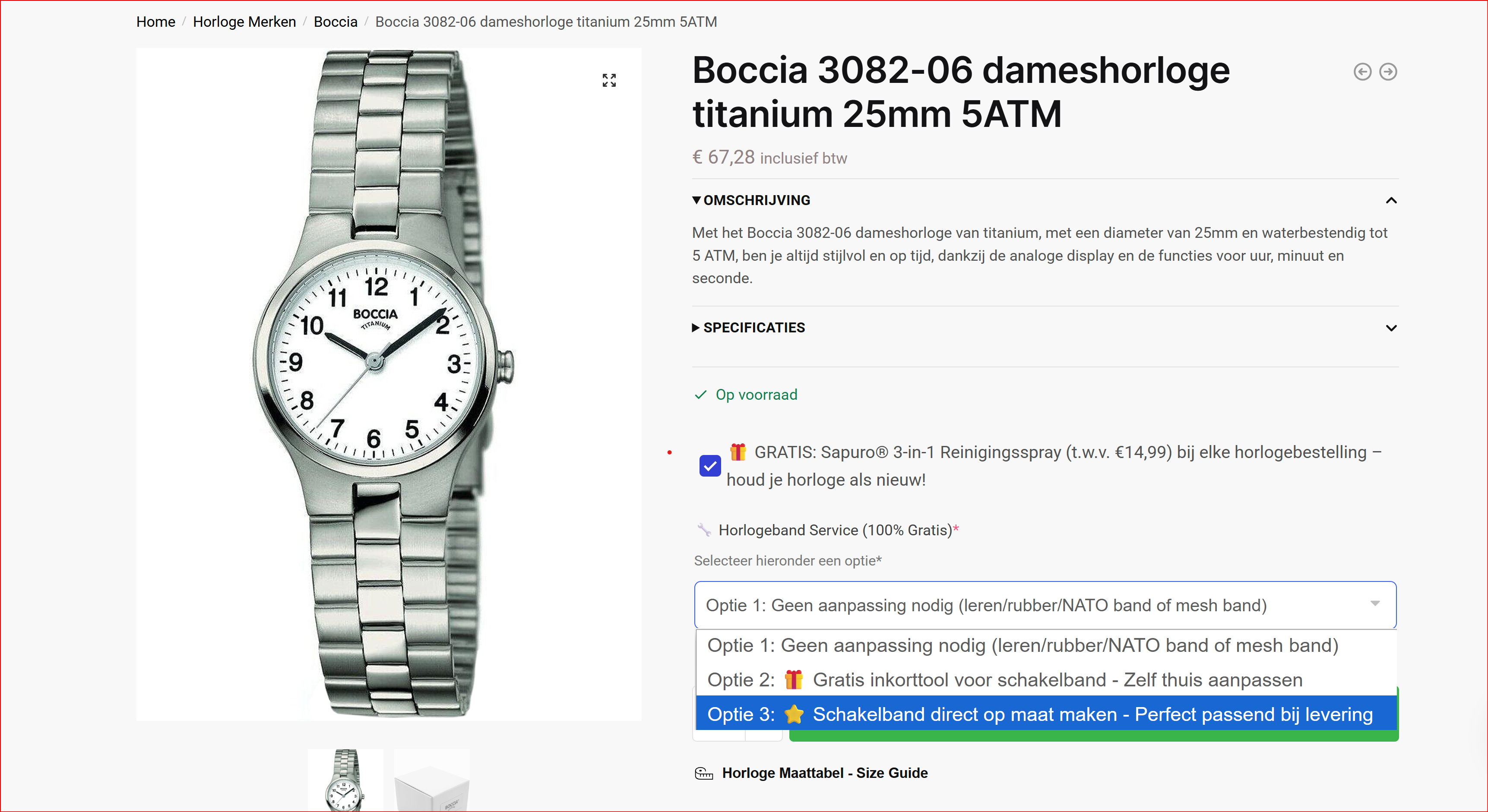 Geef dan meteen je maat dan door via het veld “Horlogeband Service (100% Gratis) – Optie 3” op de productpagina van het product, net voor je het in je winkelmandje hebt geplaatst: