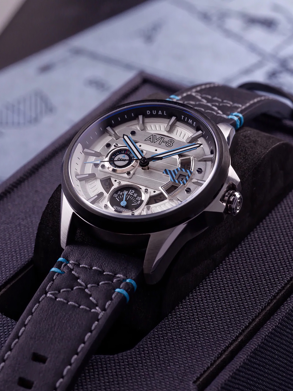 Het AVI-8 AV-4098-01 Herenhorloge Hawker Harrier Farley Multi 44mm 5ATM is een stijlvol en functioneel polshorloge met een zilveren wijzerplaat, zwarte en zilveren kast, en een zwarte leren band, perfect voor de sportieve man die houdt van kwaliteit en precisie.