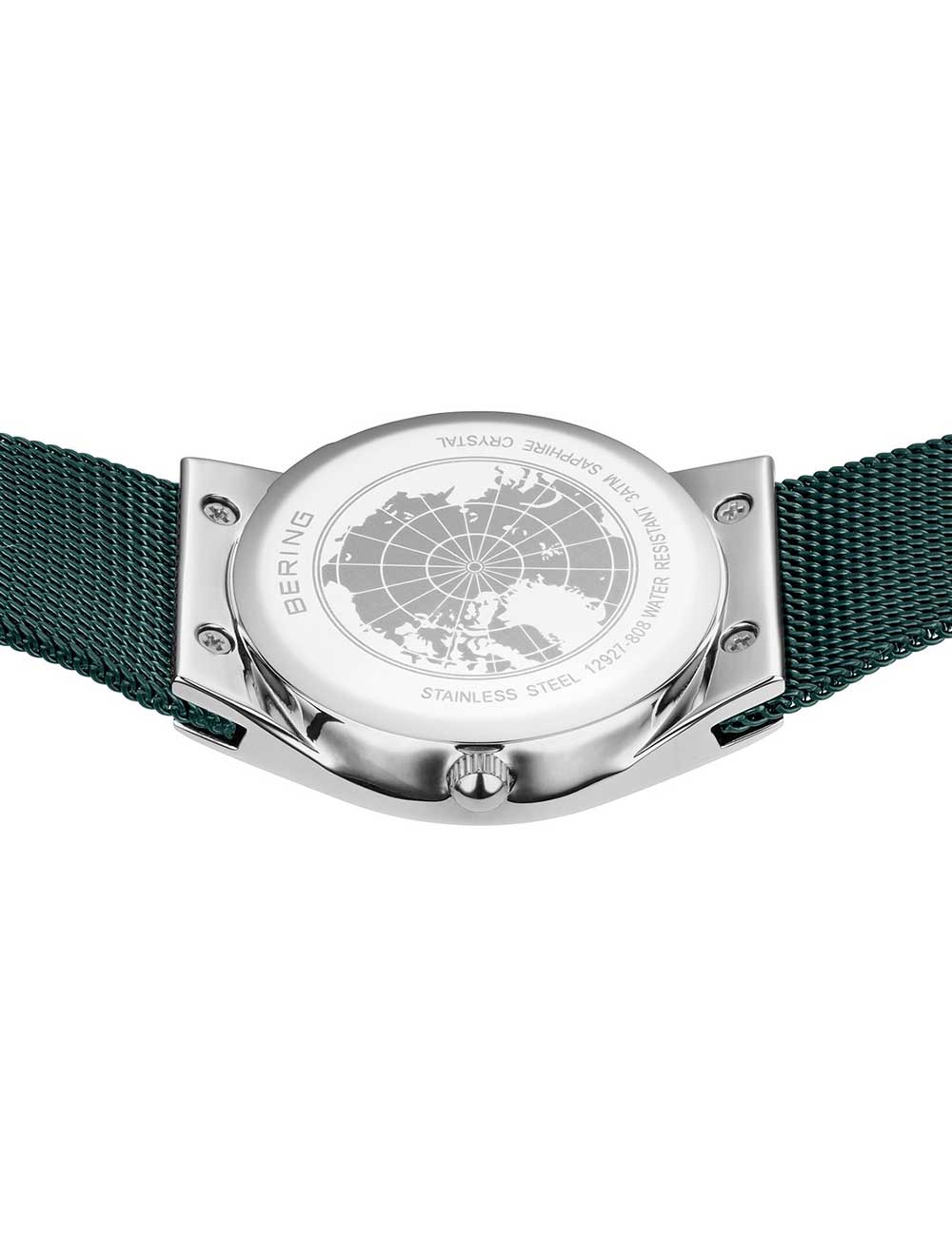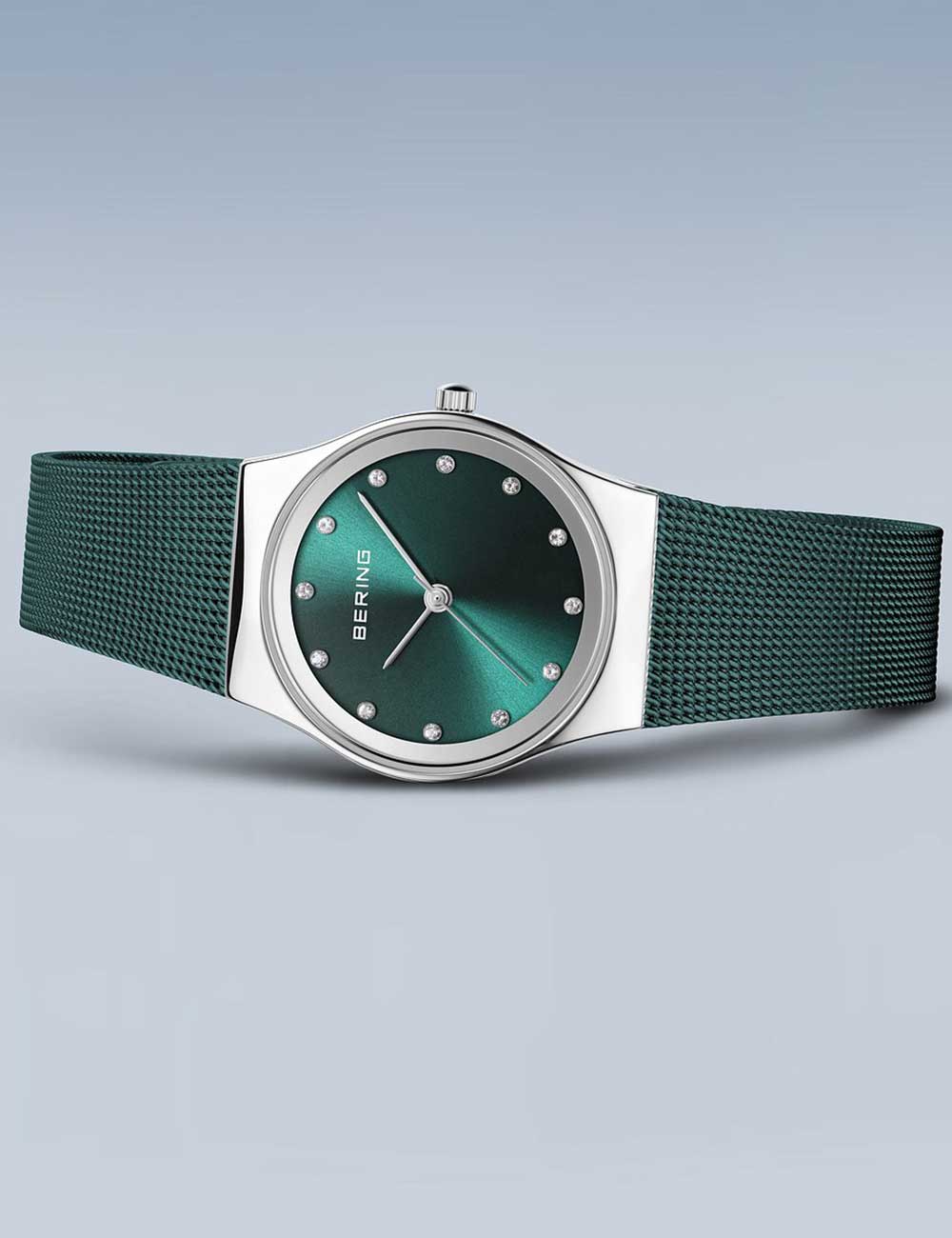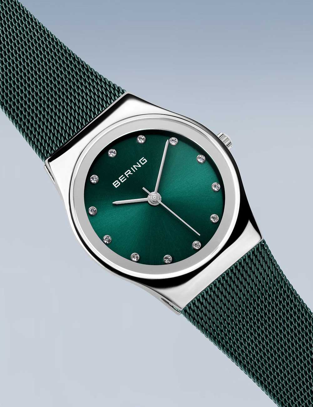 Omschrijving Verrijk je pols met dit klassieke dameshorloge van Bering, voorzien van Swarovski-kristallen, een groene wijzerplaat en een zilveren roestvrijstalen kast en band.