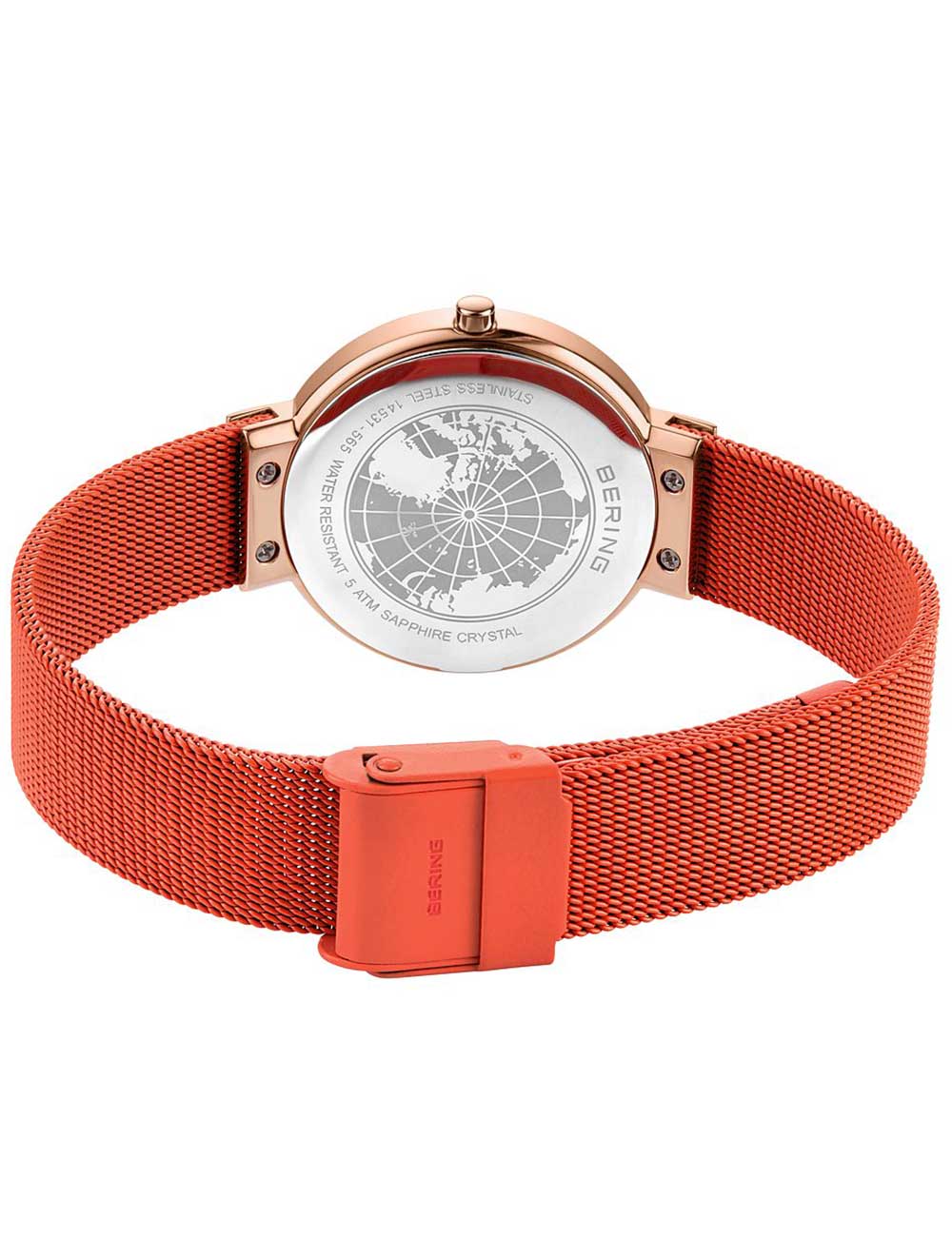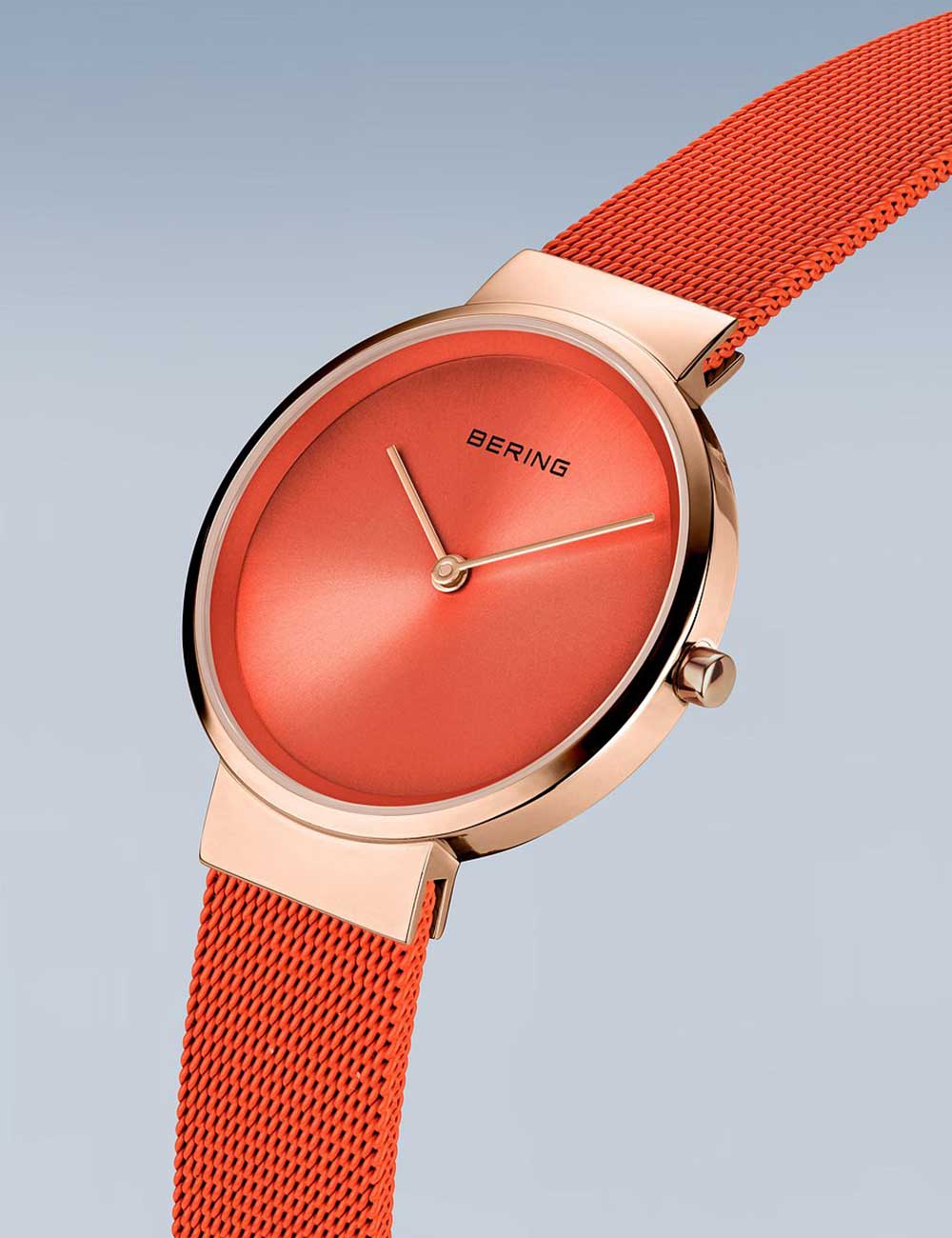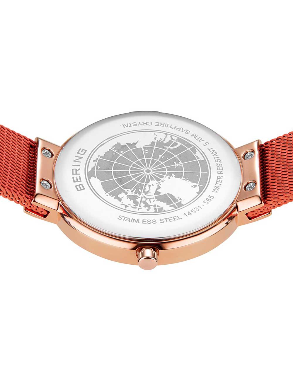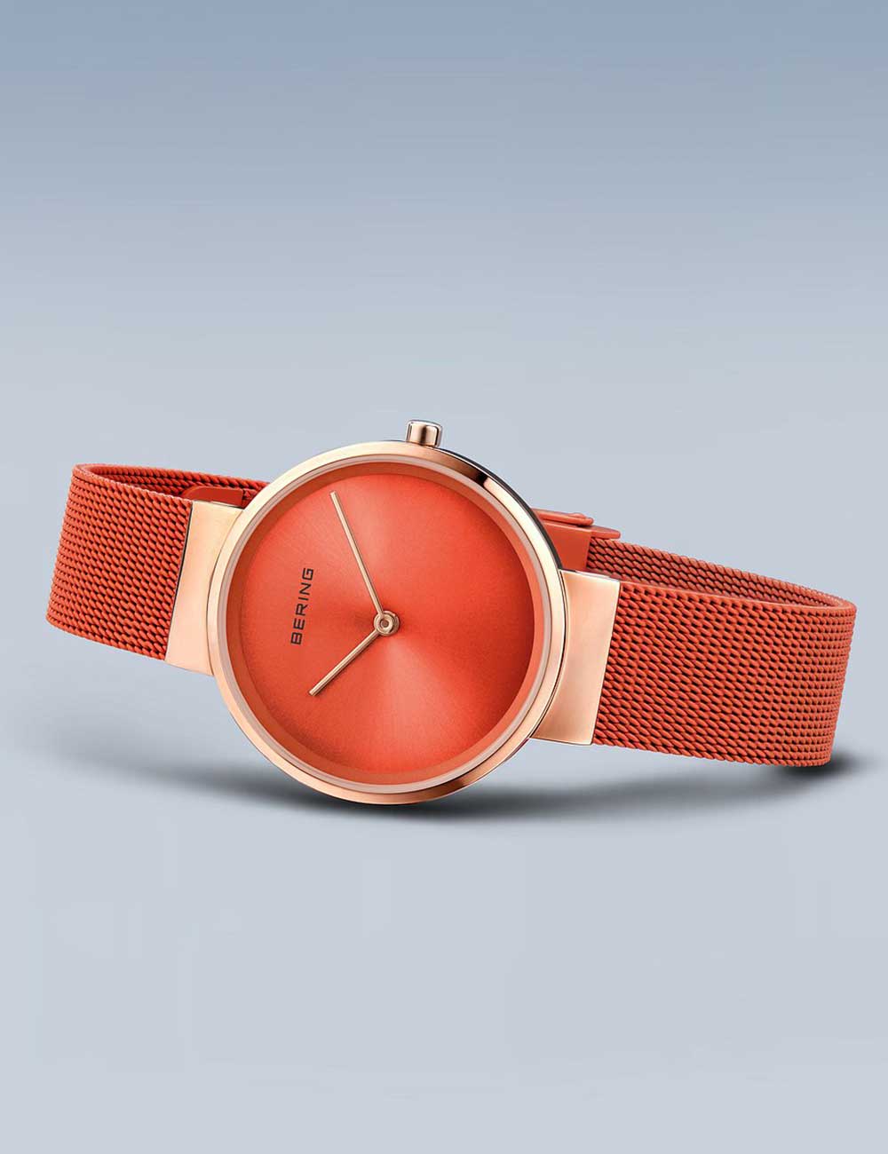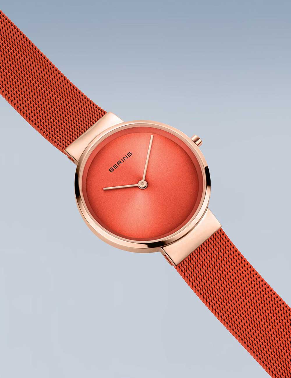 Omschrijving Met dit klassieke dameshorloge van Bering, model 14531-565, ben je altijd bij de tijd dankzij de analoge weergave van uren en minuten op de oranje wijzerplaat, waterbestendig tot 5 ATM en afgewerkt met een glanzende roségouden kast en bijpassende roestvrijstalen band in opvallend oranje.