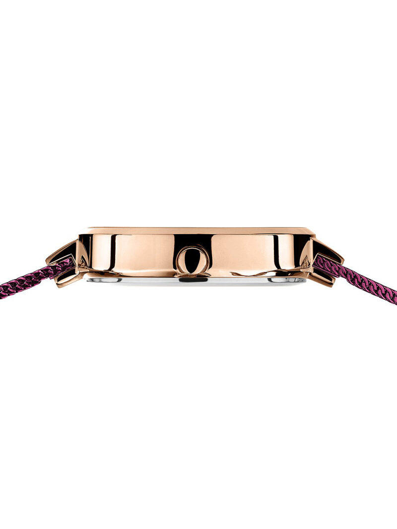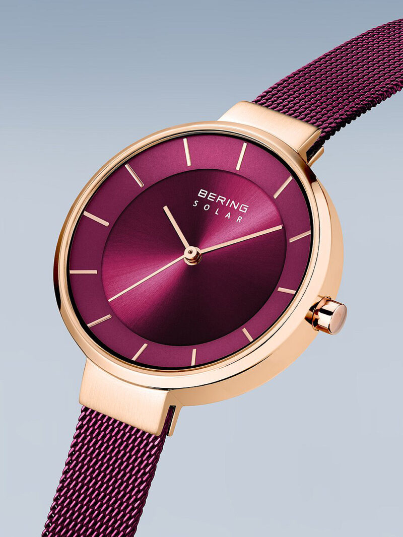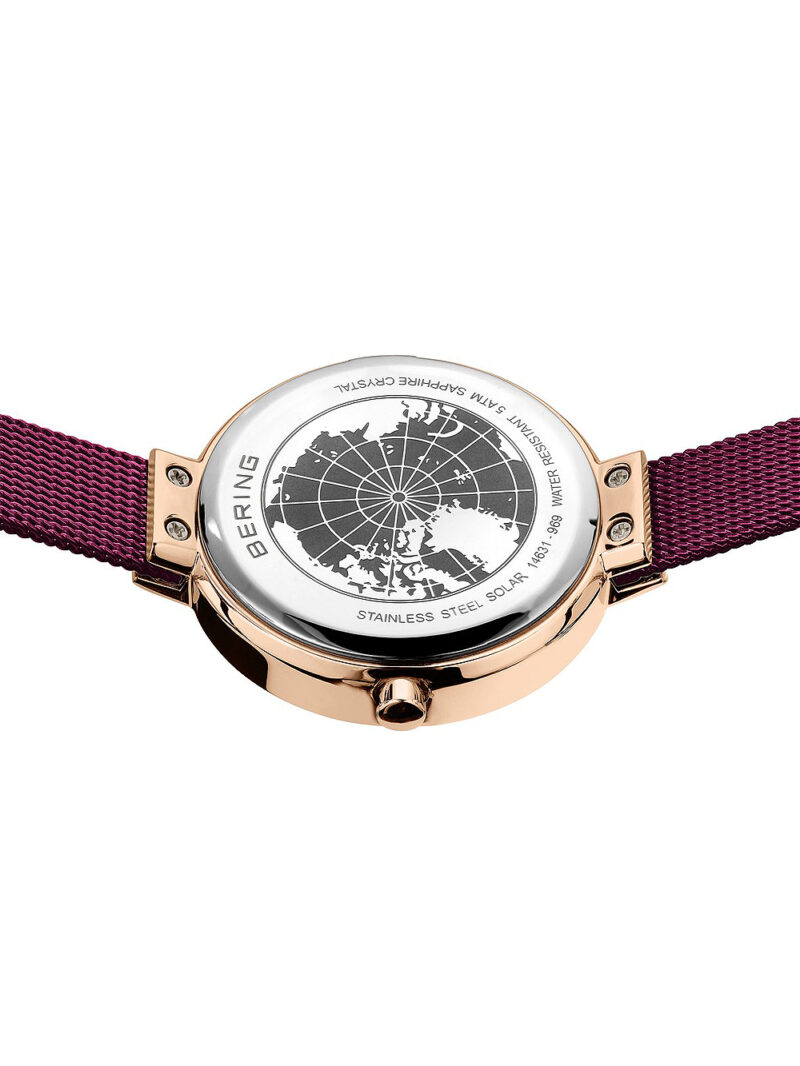 Laat de zon jouw tijd bepalen met dit elegante Bering 14631-969 dameshorloge, met een paarse wijzerplaat en roségouden kast op zonne-energie en een waterbestendigheid van 5 ATM.