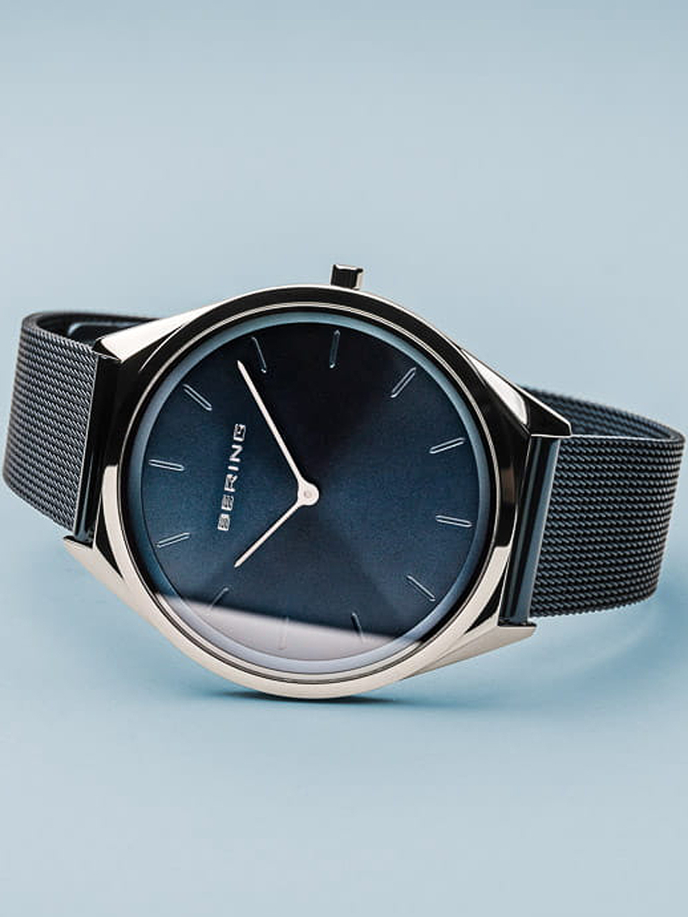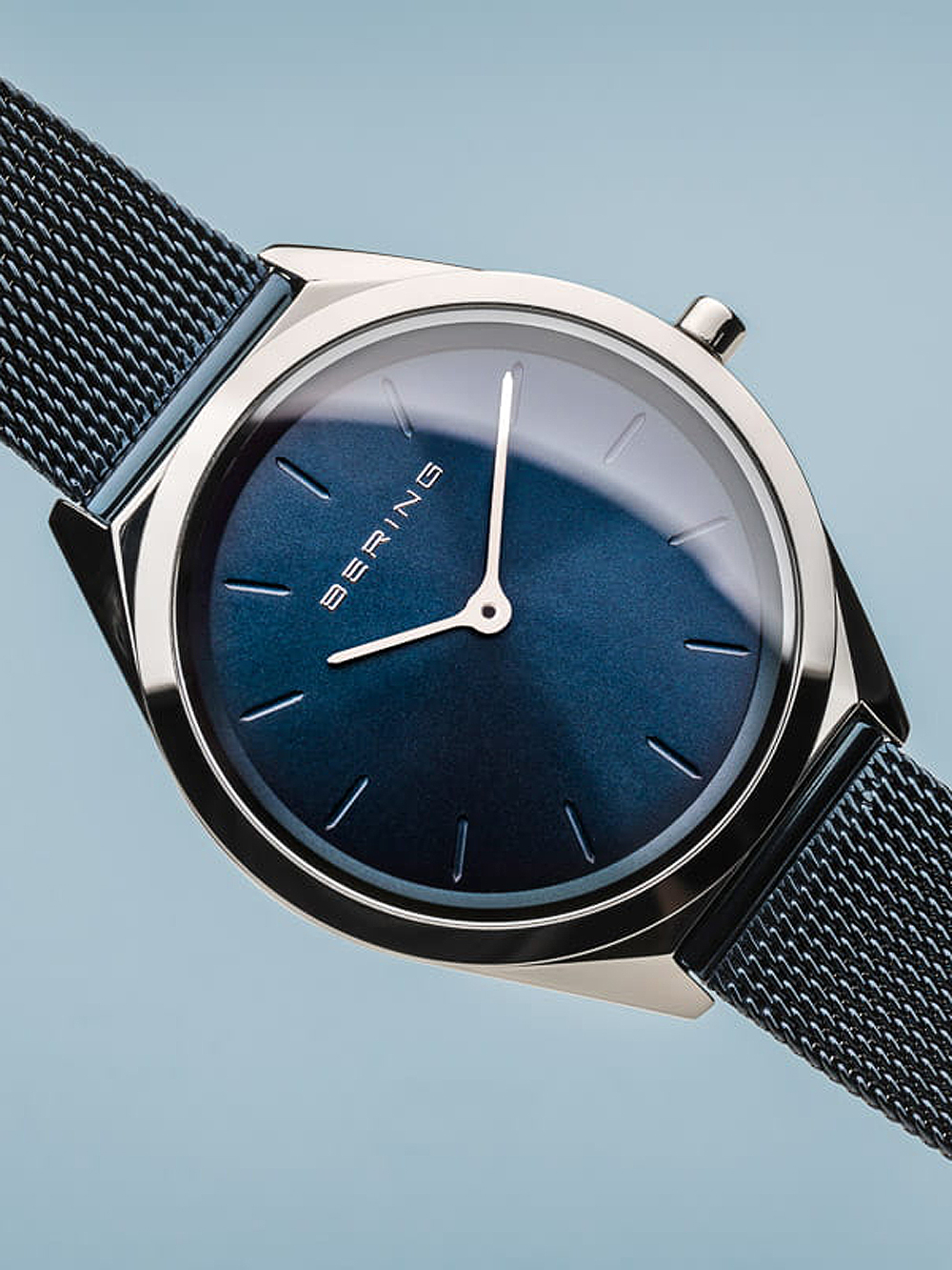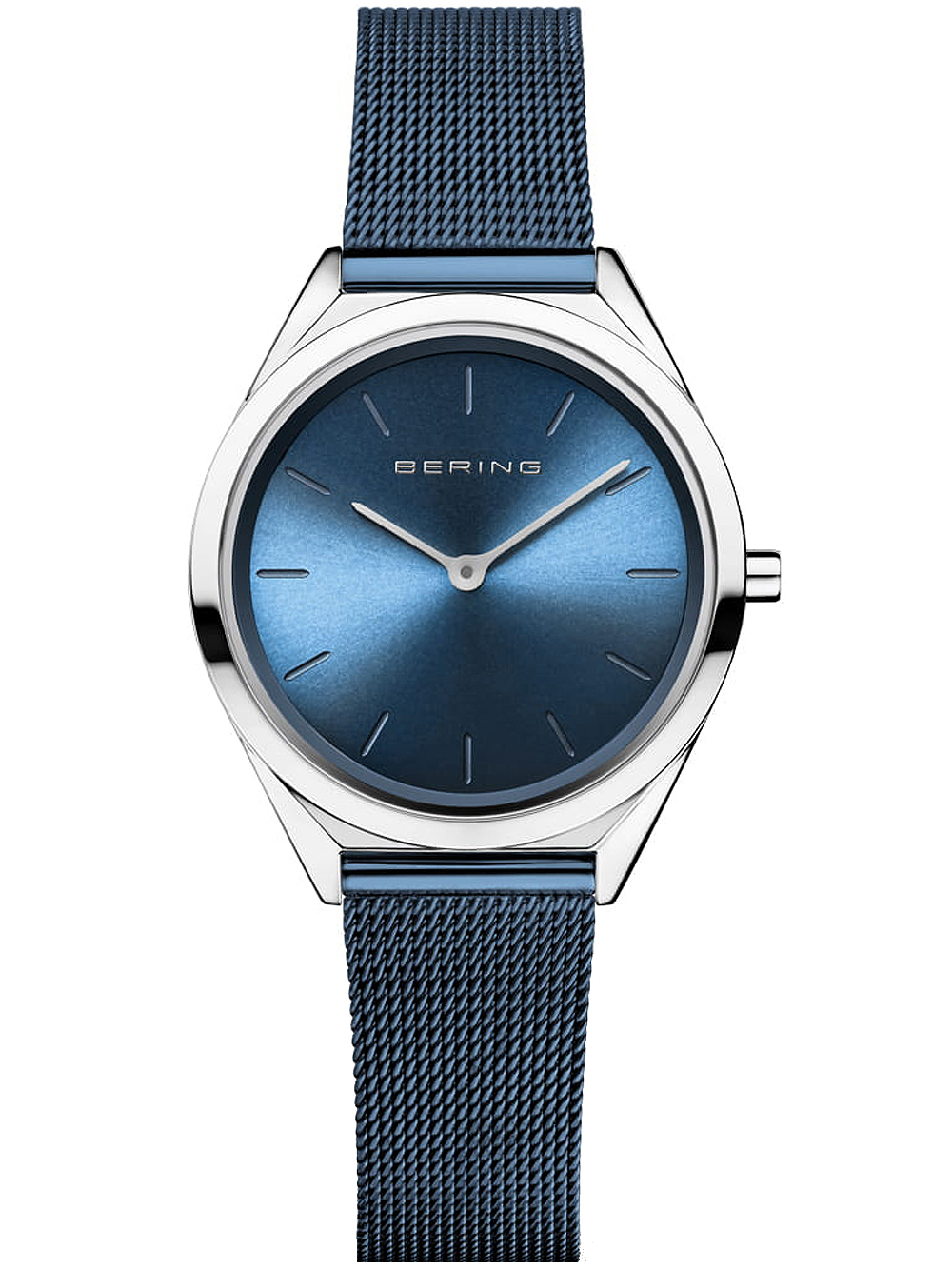 Omschrijving Met het elegante Bering 17031-307 Ultra Slim dameshorloge van 31mm, voorzien van een blauwe wijzerplaat en anti-reflecterend saffierglas, ben je altijd stijlvol en op tijd.