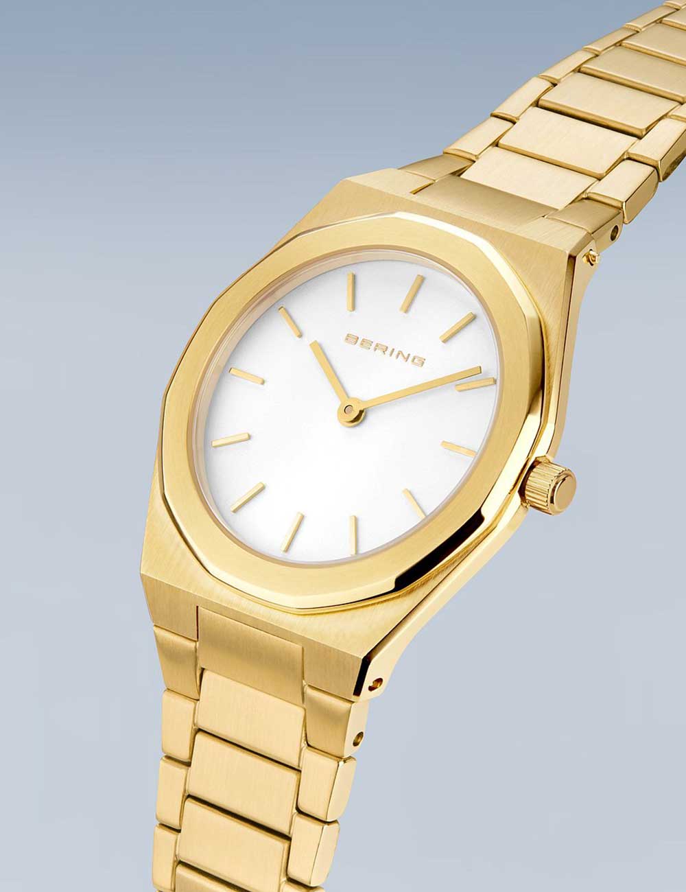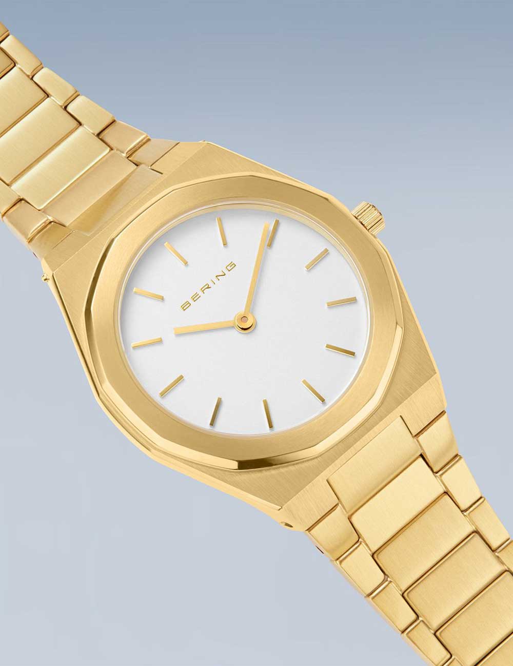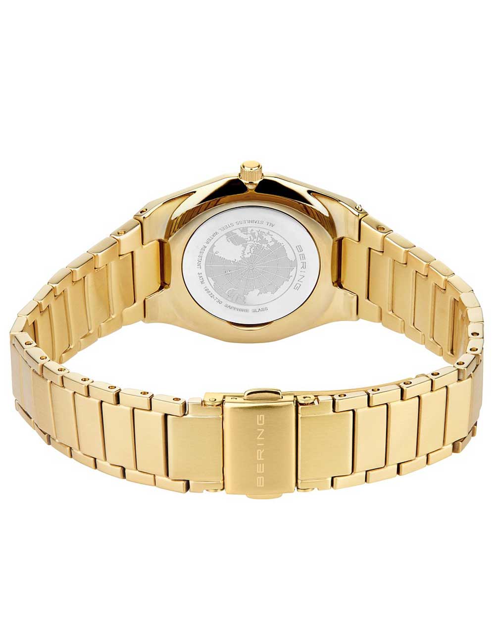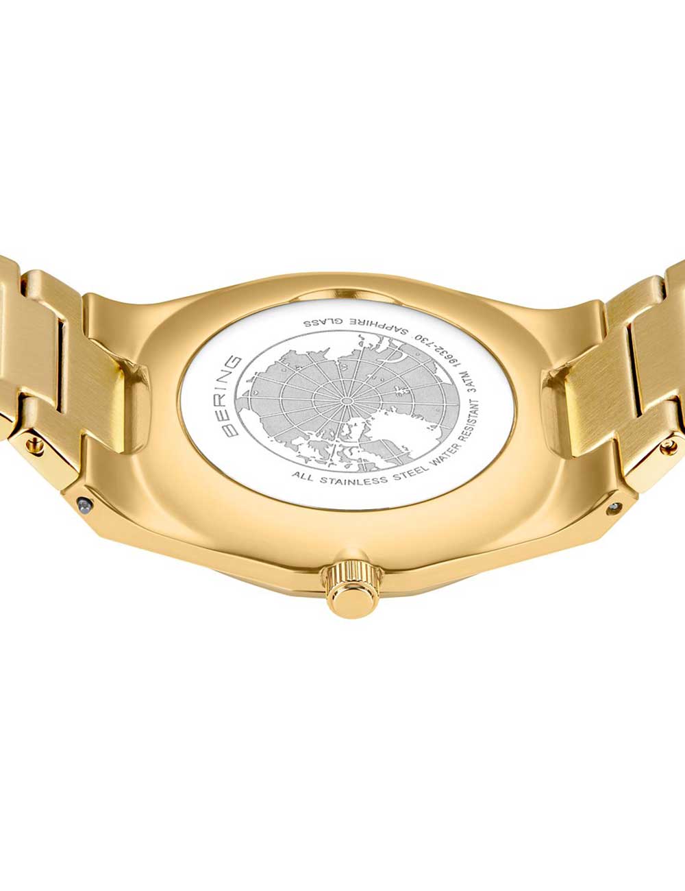 Omschrijving Stijlvol en tijdloos, dit Bering 19632-730 dameshorloge met klassiek 32 mm design en gouden details is waterbestendig tot 3 ATM en heeft een anti-reflecterend saffierglas.