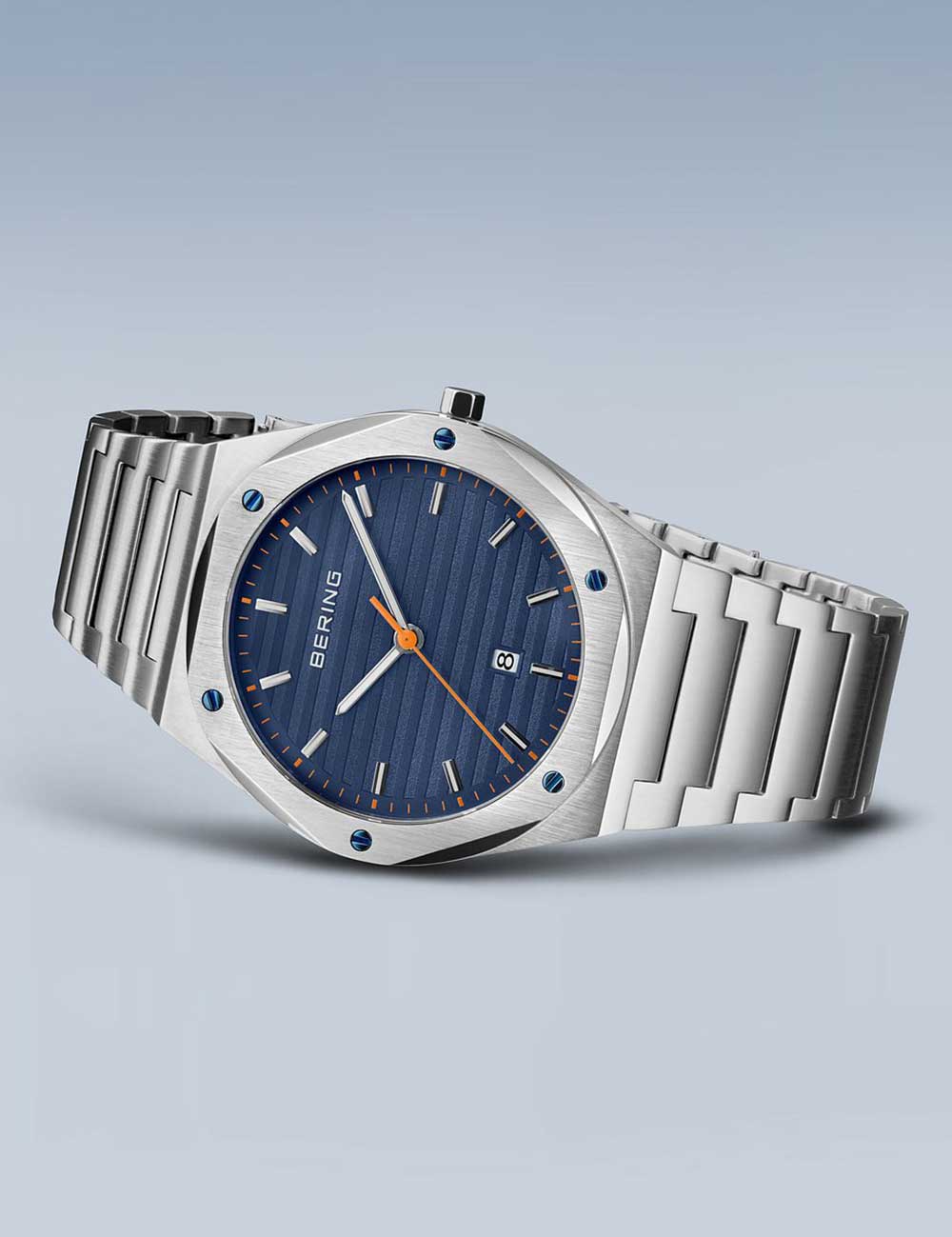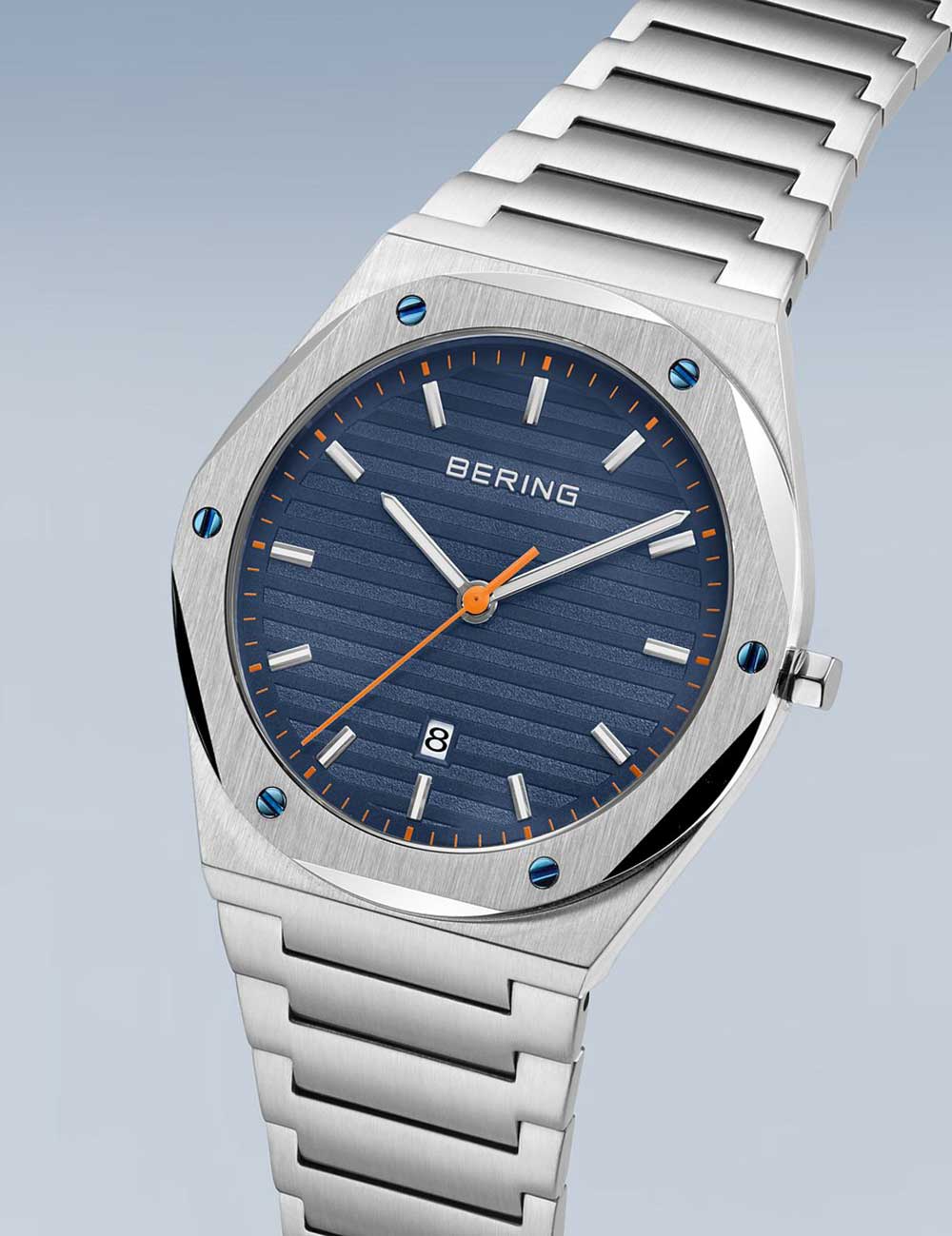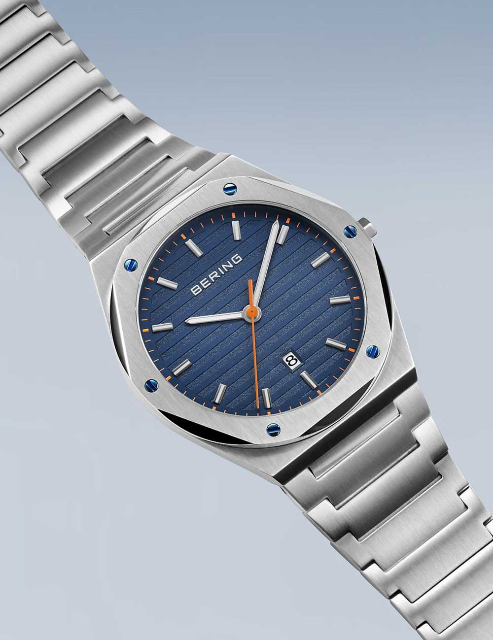 Klassiek herenhorloge van Bering met blauwe wijzerplaat, 10ATM waterdicht en een modern design, perfect voor de fashionable man.