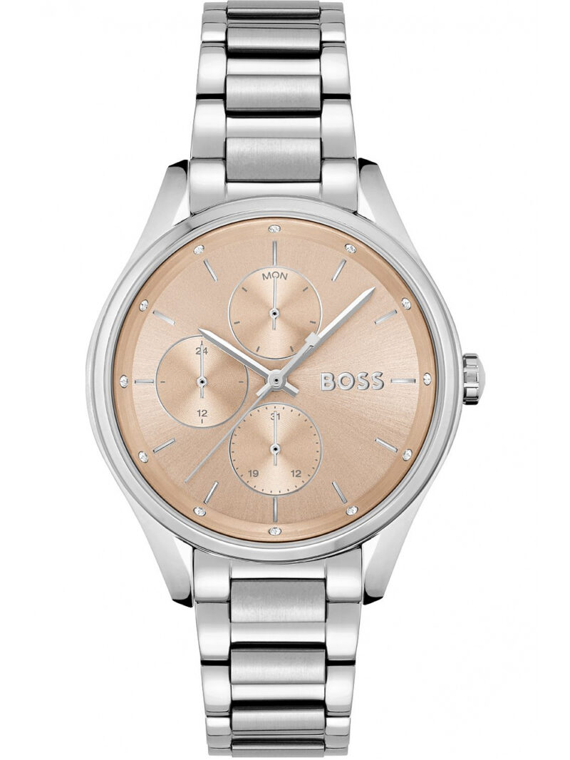 Omschrijving Het BOSS 1502604 Koers Dames polshorloge is een imposante en moderne accessoire met rosé gouden details, een 36 mm kast en een waterbestendigheid van 3 ATM.