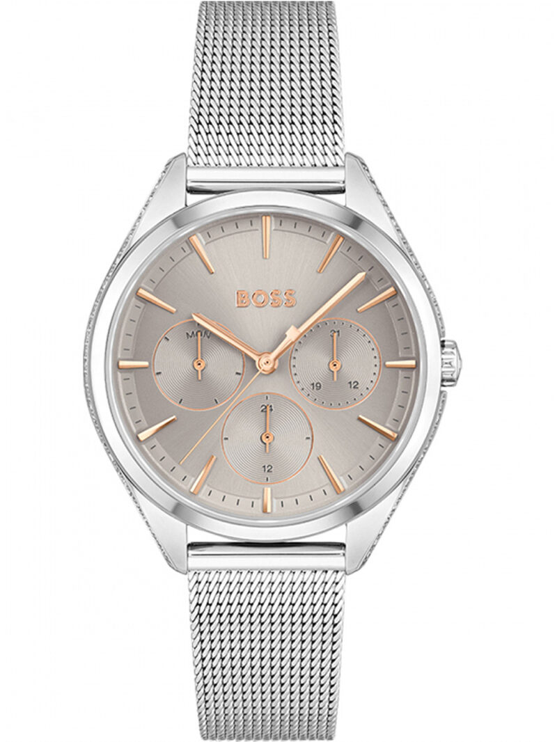 Omschrijving Met het sophisticated BOSS 1502638 Saya dames polshorloge van 38 mm, waterdicht tot 3 ATM, ben je altijd bij de tijd en straal je elegantie uit, afgewerkt met zirconia en een zilveren roestvrijstalen band.