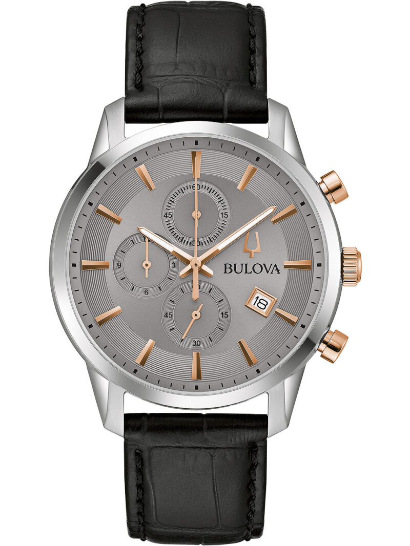 Omschrijving Met het Bulova 98B409 Sutton chronograaf herenhorloge 41 mm 3ATM ben je altijd stijlvol én op tijd, dankzij de grijze wijzerplaat, chronograaf functies en het moderne design.