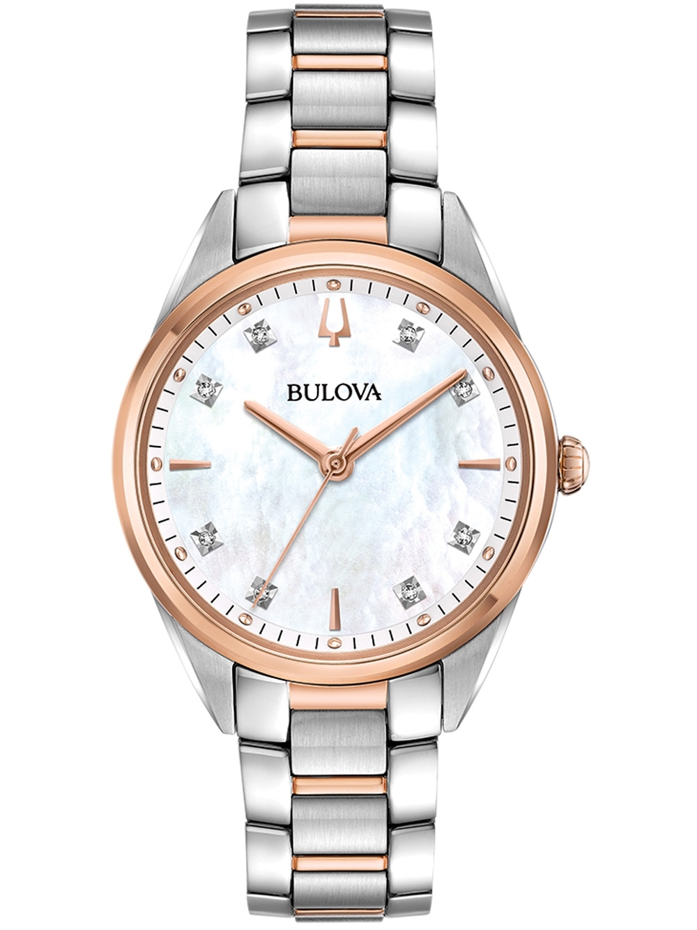 Omschrijving Het Bulova 98P183 Classic dames polshorloge van 34 mm is een elegant en tijdloos horloge met een witte wijzerplaat, rosé gouden en zilveren accenten en een diamanten rand, voorzien van een batterij (quartz) uurwerk en anti-reflecterend saffierglas, waterbestendig tot 3 ATM.