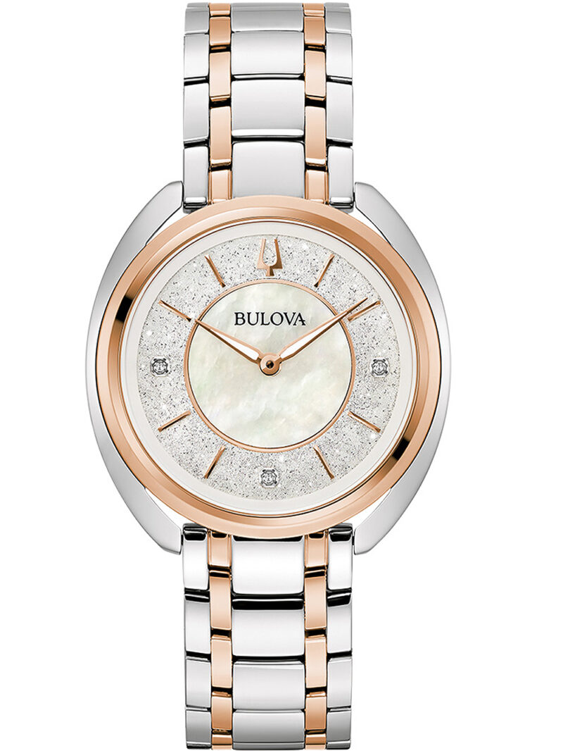 Omschrijving Met dit elegante Bulova 98P219 dameshorloge van 35 mm, voorzien van een zilveren wijzerplaat en rosé gouden en zilveren kast, ben je altijd stijlvol op tijd en klaar voor elke gelegenheid.