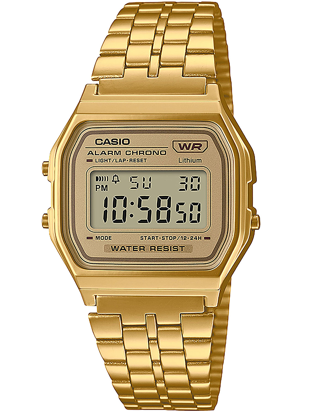 Omschrijving Het Casio A158WETG-9AEF Vintage 33 mm polshorloge is een modern en stijlvol accessoire met een gouden wijzerplaat, digitale display en handige functies zoals alarm, kalender en stopwatch, geschikt voor zowel dames als heren.
