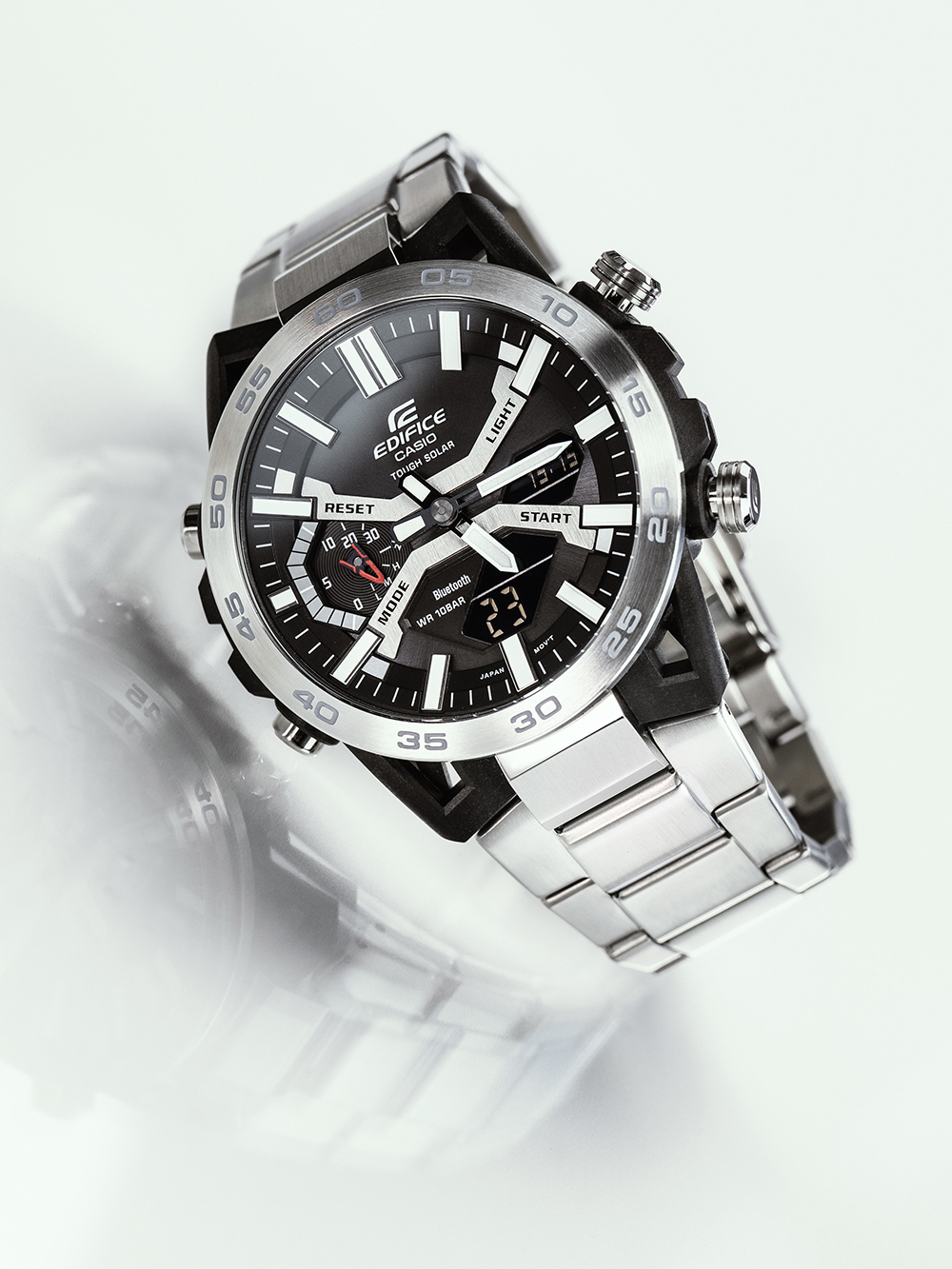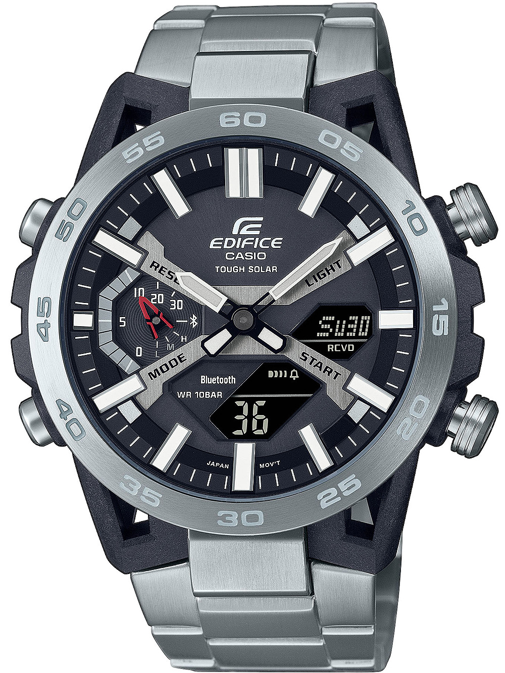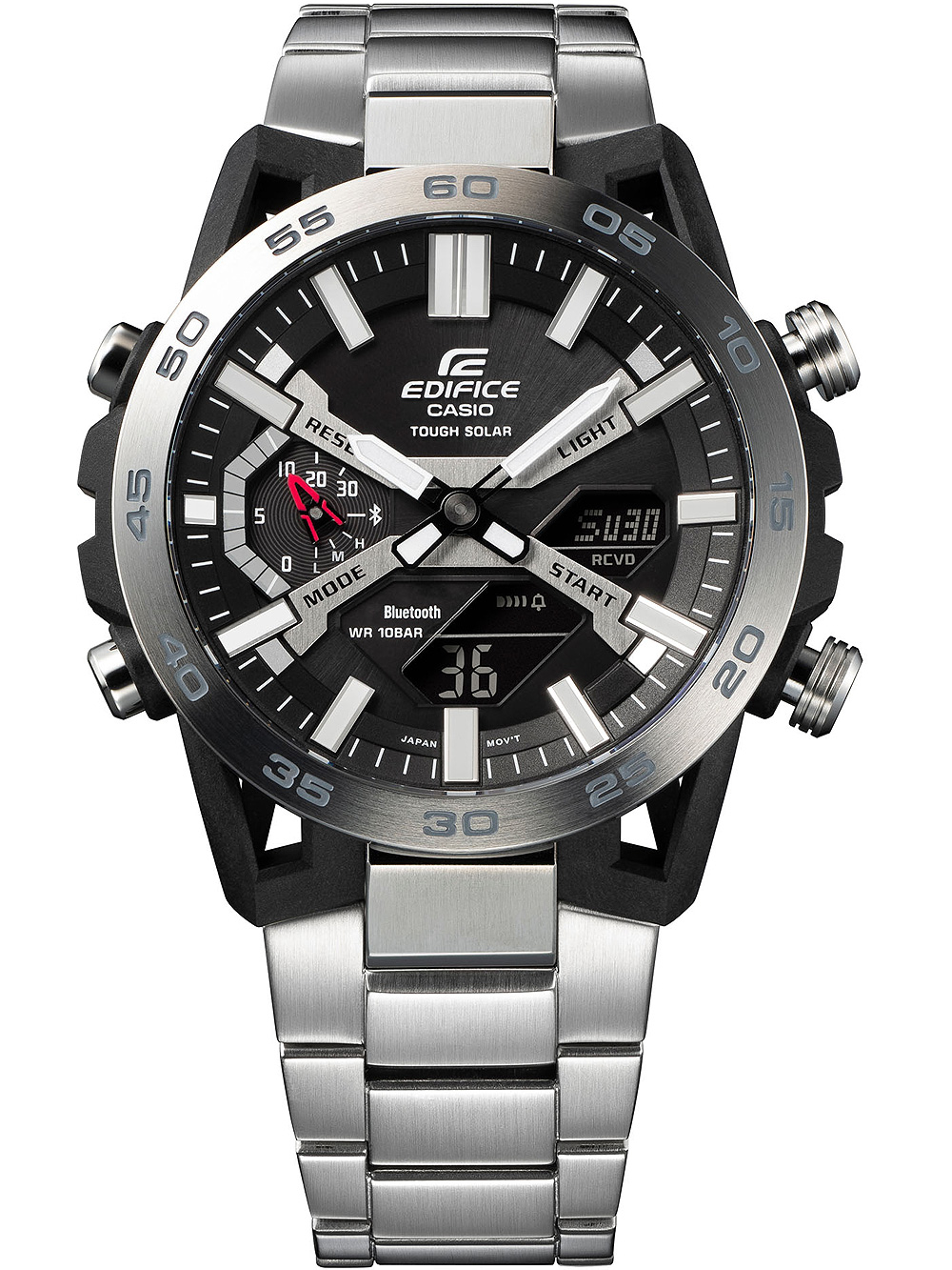 Specificaties Oppervlakteafwerking: Mat, GepolijstSerie: Edifice Zonne-energie 48mmSluiting: VouwsluitingAanzetbreedte – Lugbreedte van Horlogeband (mm): 25Tijdfuncties: 12-24 uursweergave, Alarm, Automatische kalender, Blauwtooth, Datum, Dag, Uur, Minuut, Telefoonzoeker, Save energy mode, Sec, Zonne-energie, Stopfunctie, Timer, Wereldtijd, GPS-trackerBezel: VastKleur van Horlogekast: Zwart, ZilverMateriaal Horlogekast: Koolstof, Roestvrij staalDikte Horlogekast (mm): 12Breedte van Horlogekast (mm): 48Achterkant Horlogekast: geschroefd, Roestvrij staal achterkantKleur Wijzerplaat : GrijsWijzerplaatweergave: Analoog, DigitaalDoelgroep: HerenHorlogeglas: Gehard mineraalglasVerlichting Horloge: Super-IlluminatorType Uurwerk: Zonne-energie (quartz)Soort Sluiting: VouwsluitingKleur Horlogeband: ZilverHorlogeband: Roestvrij staalStijl Horloge: SportyWaterbestendigheid (ATM): 10Maximale Polsomtrek (mm): 210Inclusief: Horlogedoos, handleiding en garantiebewijs