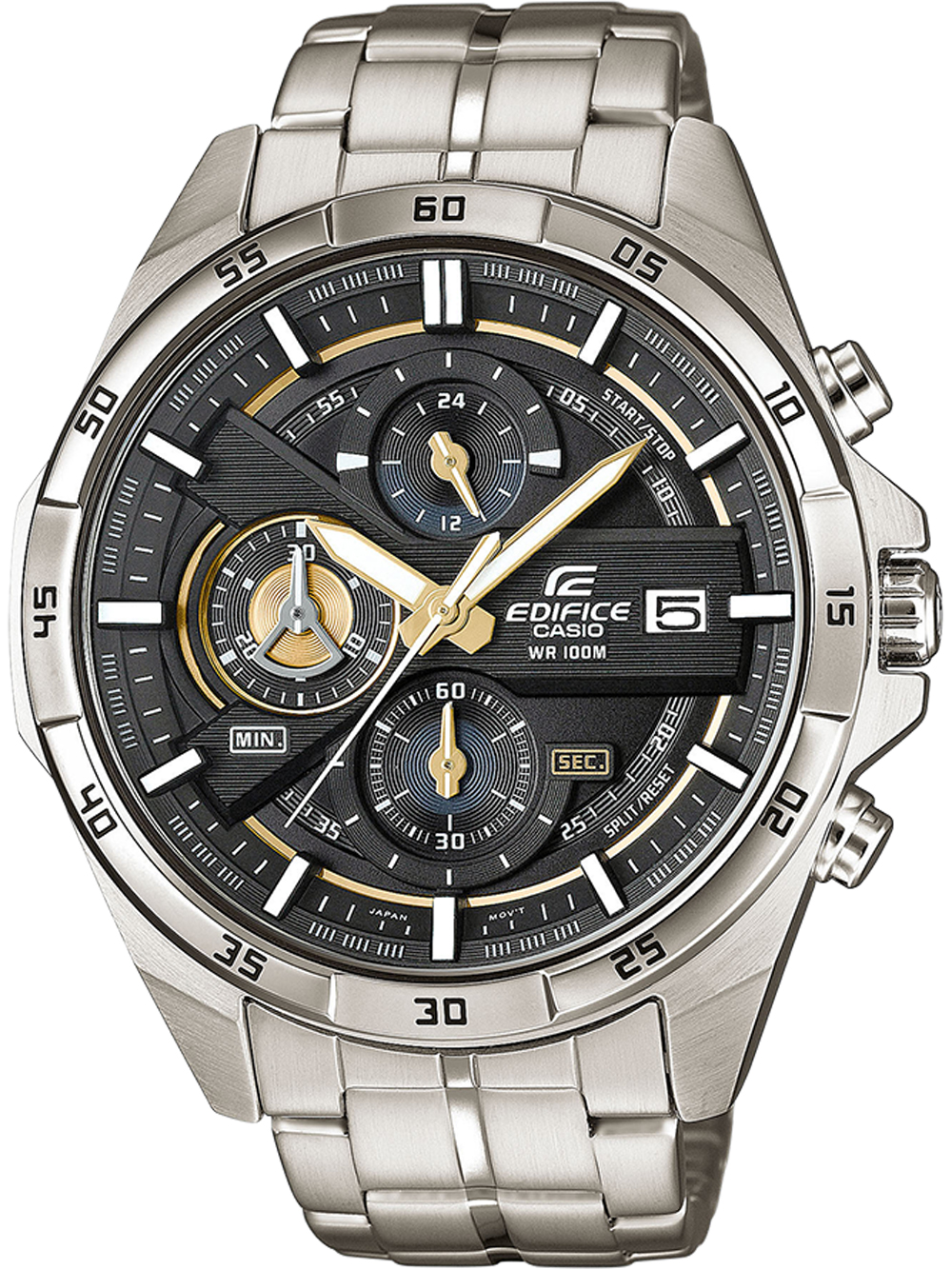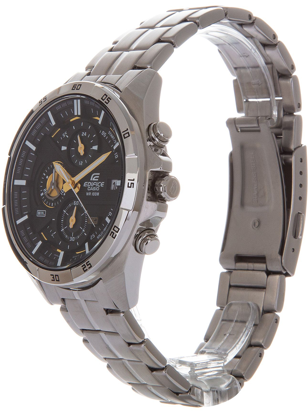 Specificaties Oppervlakteafwerking: Mat, GepolijstSerie: Edifice 46mmSluiting: VouwsluitingAanzetbreedte – Lugbreedte van Horlogeband (mm): 22Tijdfuncties: 24-hours, Chronograaf, Datum, Uur, Minuut, SecBezel: VastKleur van Horlogekast: ZilverMateriaal Horlogekast: Roestvrij staalDikte Horlogekast (mm): 13Breedte van Horlogekast (mm): 46Achterkant Horlogekast: geschroefd, Roestvrij staal achterkantKleur Wijzerplaat : ZwartWijzerplaatweergave: AnaloogDoelgroep: HerenHorlogeglas: Gehard mineraalglasVerlichting Horloge: Verlichte wijzersType Uurwerk: Batterij (quartz)Soort Sluiting: VouwsluitingKleur Horlogeband: ZilverHorlogeband: Roestvrij staalStijl Horloge: SportyWaterbestendigheid (ATM): 10Maximale Polsomtrek (mm): 220Inclusief: Horlogedoos, handleiding en garantiebewijs