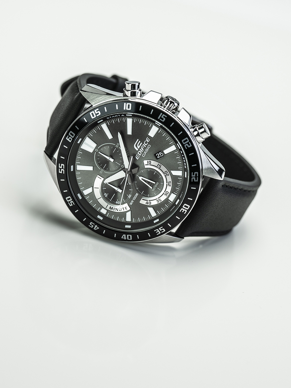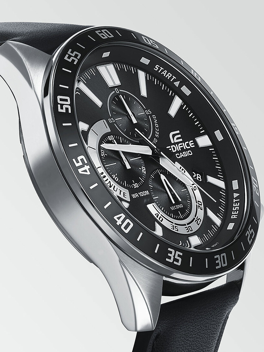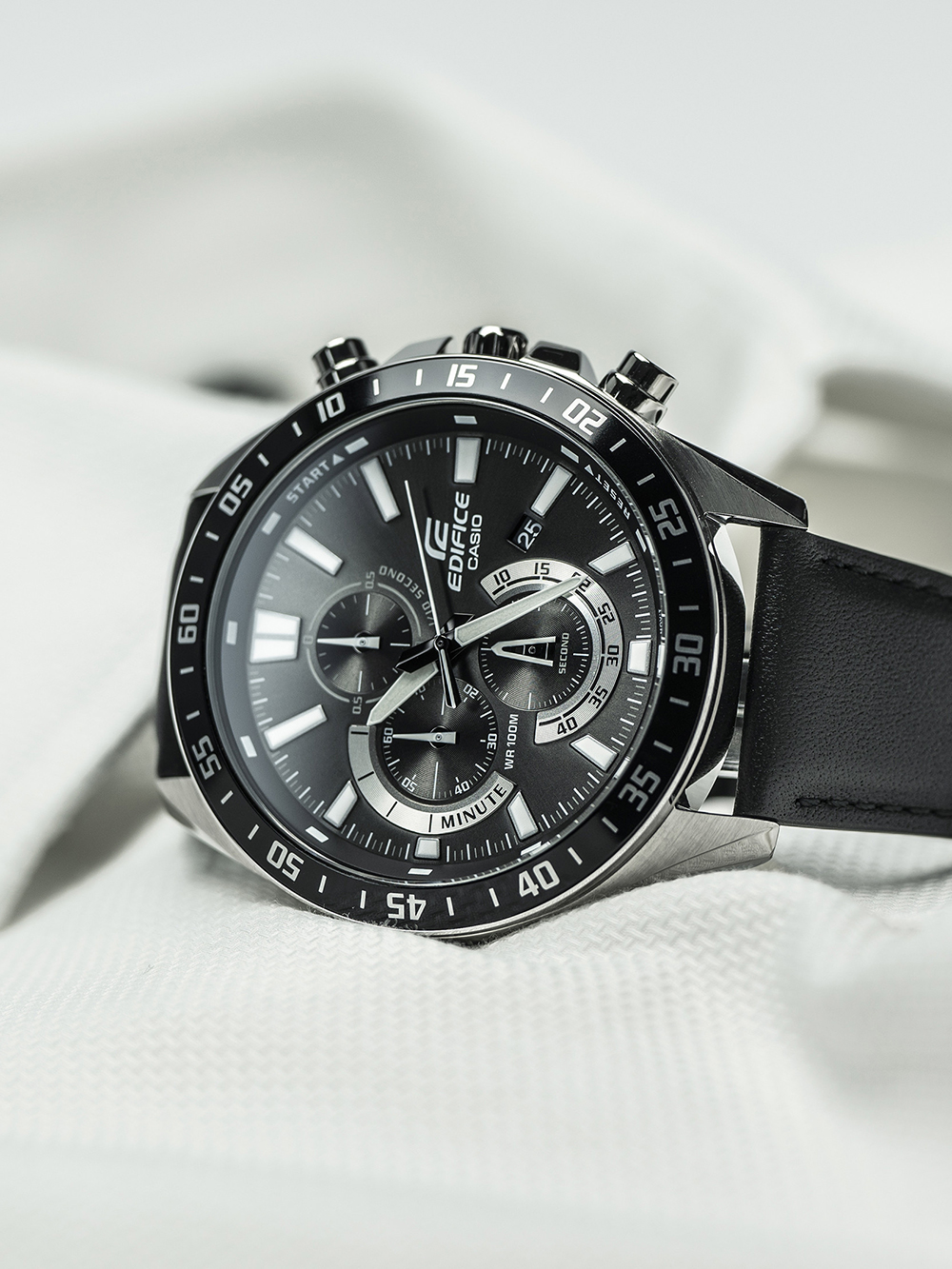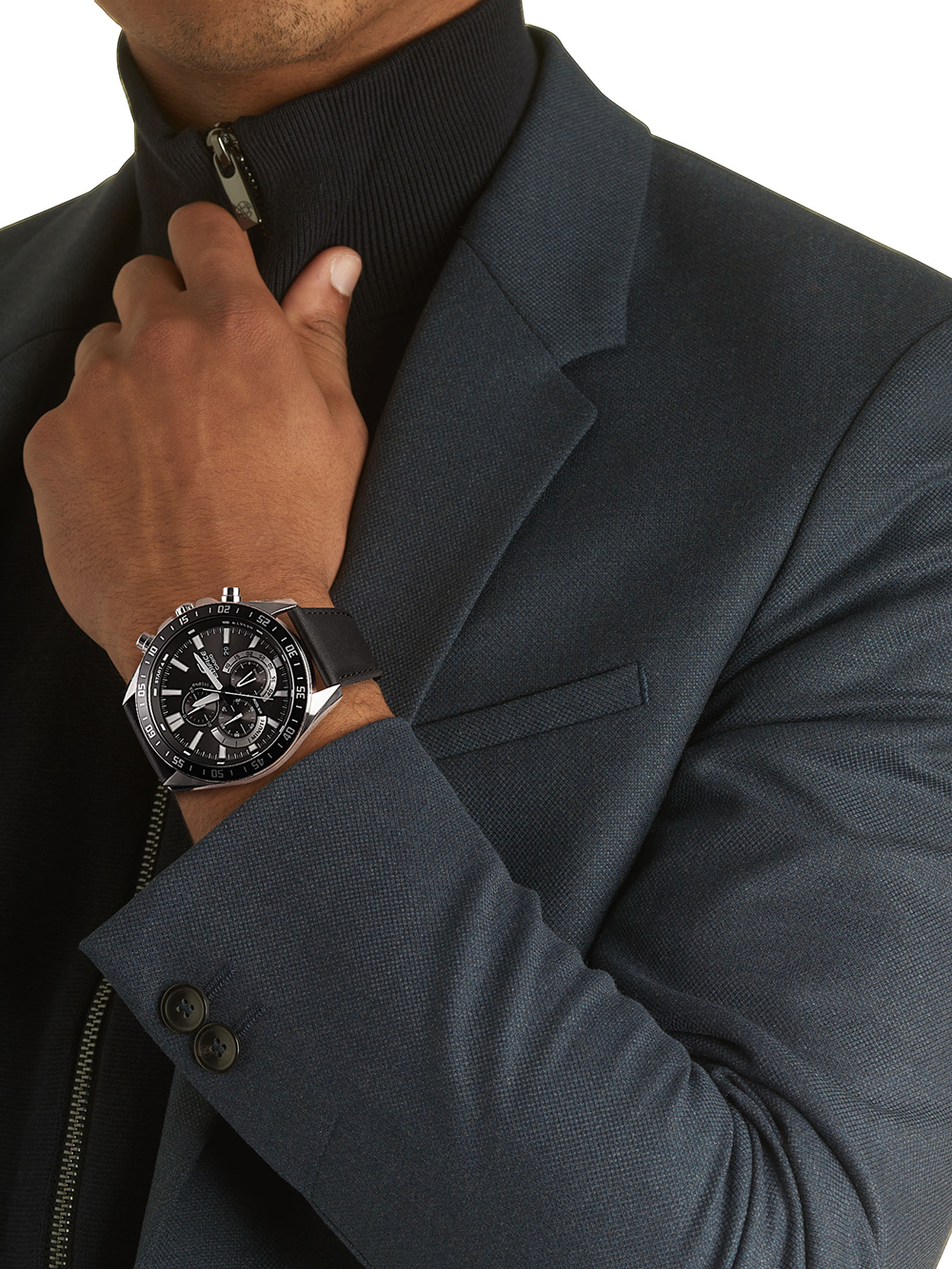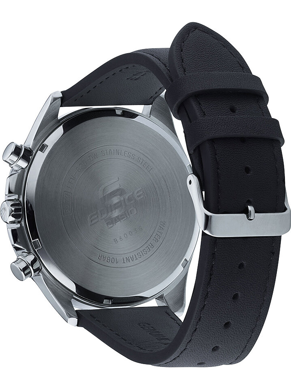 Het Casio EFV-620L-1AVUEF herenhorloge is een robuust bouwwerk met een diameter van 48 mm, 10ATM waterbestendigheid en diverse functies zoals chronograaf en datumweergave, voorzien van een zwart analoge wijzerplaat en een exquise, zwarte kalfsleren band.