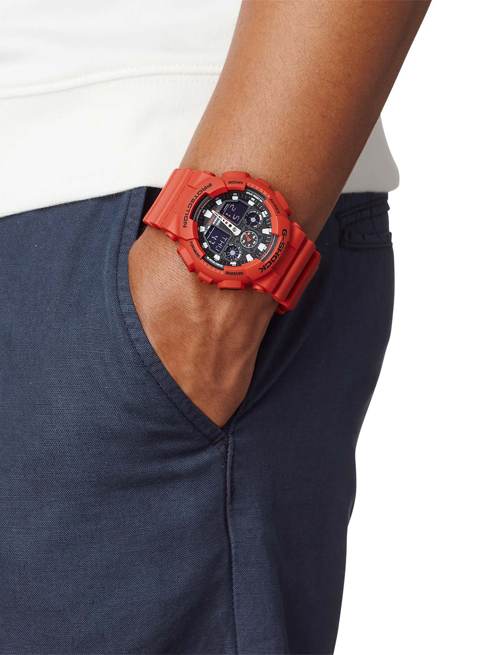 Omschrijving Het CASIO GA-100B-4AER G-SHOCK polshorloge van 51 mm met 20 ATM waterbestendigheid, chronograaf, datum- en tijdsweergave, mat rode behuizing en stoere, sportieve uitstraling, inclusief doos, instructies en garantiebewijs.