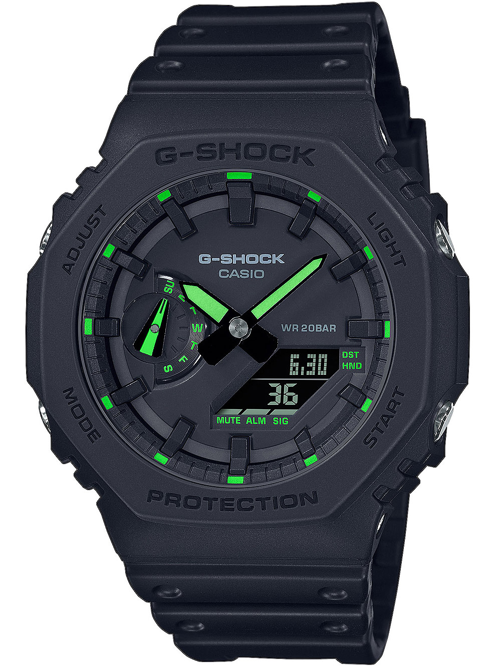 Omschrijving Het Casio GA-2100-1A3ER G-Shock heren polshorloge is een stoer en sportief horloge met een zwarte matte afwerking, analoge en digitale display, LED verlichting en een waterdichtheid van 20 ATM, geleverd met doos, instructies, verpakking en garantiebewijs.