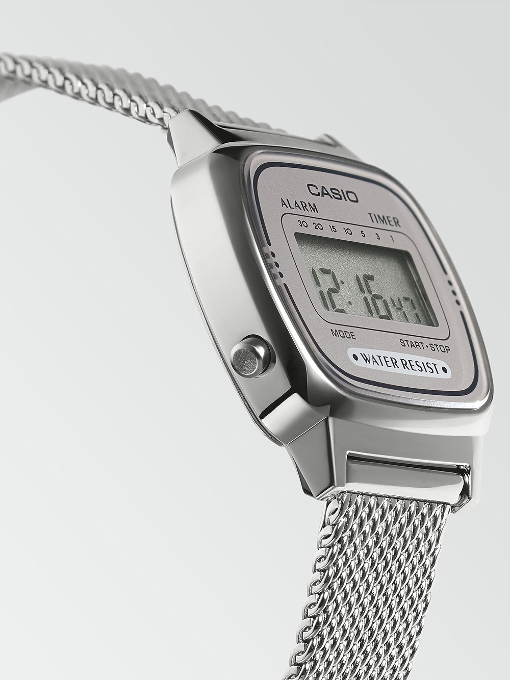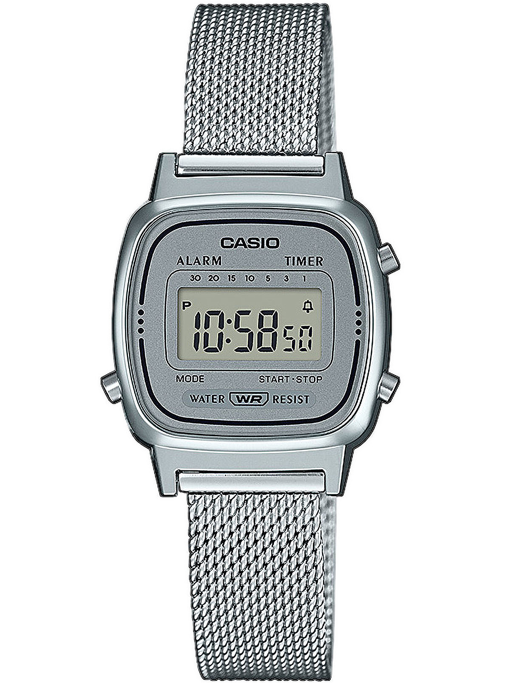 Omschrijving Ontdek de tijdloze elegantie van dit Casio LA670WEM-7EF Vintage Mini dames polshorloge met een zilveren digitale display, alarm, automatische kalender en een waterbestendigheid van 3 bar.