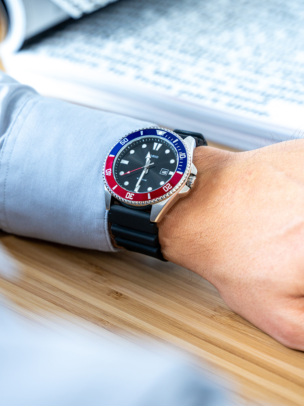 Het Casio MDV-107-1A3VEF herenhorloge uit de Collectie collectie is een stoer en sportief polshorloge met een diameter van 44 mm, waterdicht tot 20 ATM en voorzien van een zwarte wijzerplaat, draaibare bezel en matted en polished afwerking.