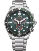 Het Citizen AT2561-81X herenhorloge is een stijlvol en sportief polshorloge met een groene wijzerplaat, Eco-Drive chronograaf en 10ATM waterbestendigheid, perfect voor de moderne man die houdt van kwaliteit en functionaliteit.