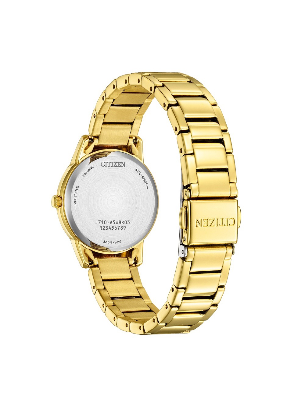 Het elegante Citizen FE1242-78D dameshorloge met een diameter van 29 mm en Eco-Drive technologie is een stijlvol accessoire voor elke vrouw, met een gouden kast en band, een witte wijzerplaat met datumweergave en waterbestendigheid tot 3 ATM.