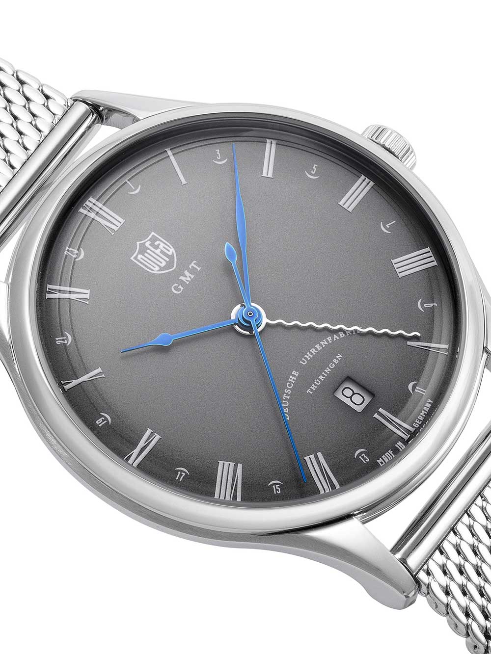 Ontdek de perfecte combinatie van stijl en functionaliteit met het DuFa DF-9006-11 Weimar GMT herenhorloge, voorzien van 2 tijdzones, datumweergave en een strakke grijze wijzerplaat, verpakt in een zilveren roestvrijstalen kast en armband.