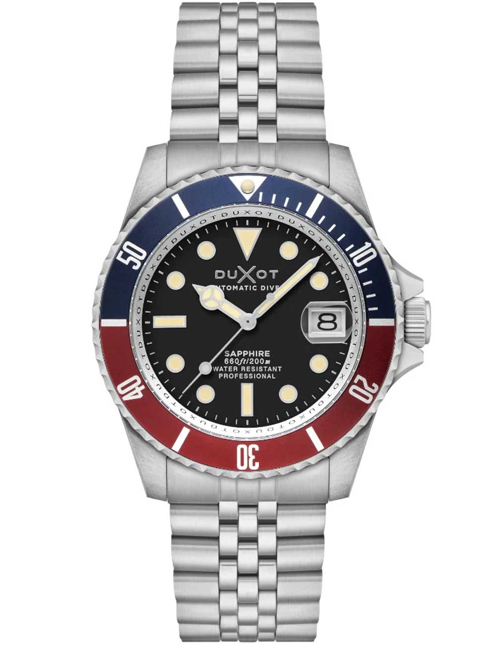 Het Duxot DX-2057-11 herenhorloge uit de Atlantica serie is een automatisch duikershorloge van 42 mm met 20ATM waterbestendigheid, voorzien van een zwarte wijzerplaat, Japanse 24 jewels automatisch uurwerk en een zilverkleurige roestvrijstalen kast en band.