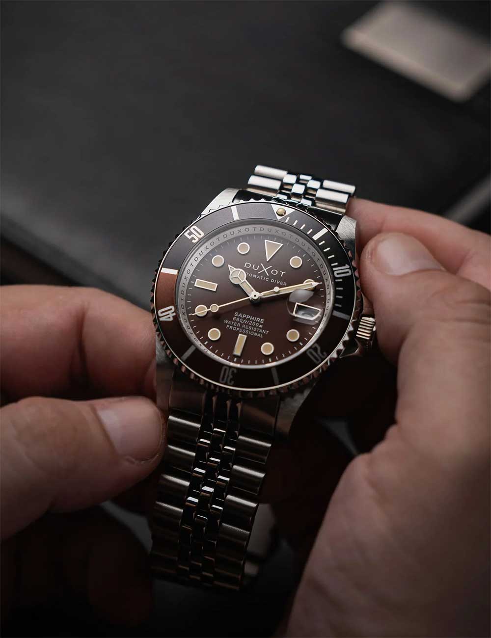 Ontdek de perfecte mix van stijl en functionaliteit met het Duxot DX-2057-99 herenhorloge Atlantica – een automatisch duikershorloge van 42 mm met 20ATM waterbestendigheid en een prachtige bruine wijzerplaat, afgewerkt met een zilveren roestvrijstalen kast en armband.