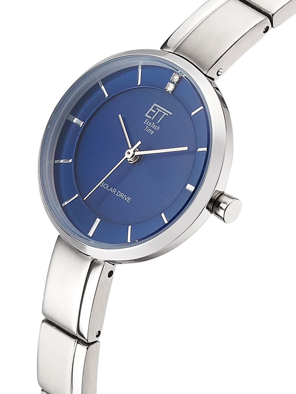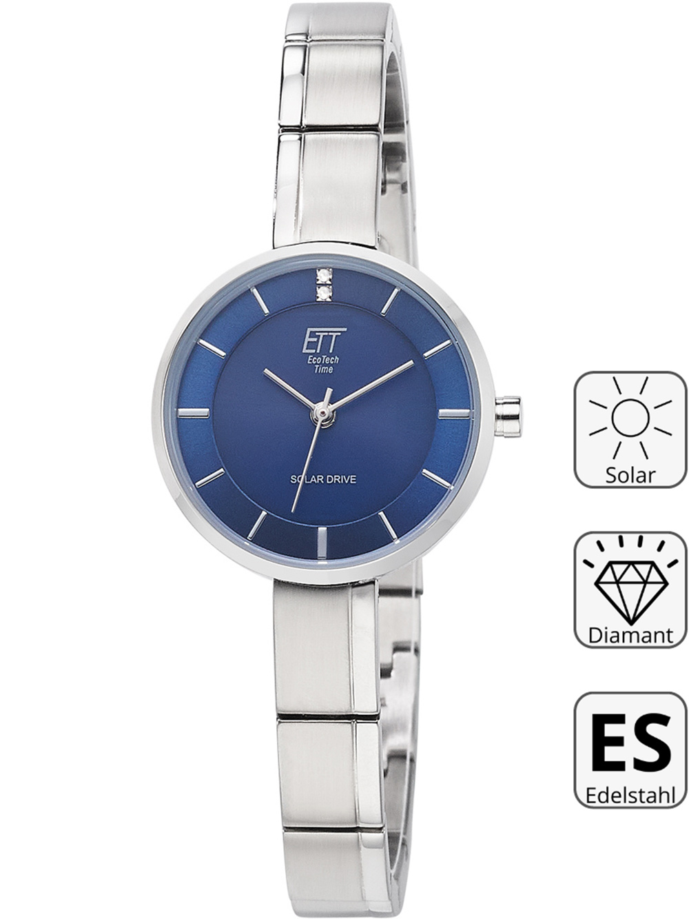 Met het ETT ELS-12149-32M Diamond Lady Zonne-energie Drive dameshorloge ben je altijd bij de tijd en straal je elegantie uit dankzij de blauwe wijzerplaat, zilveren behuizing en subtiele diamanten details.