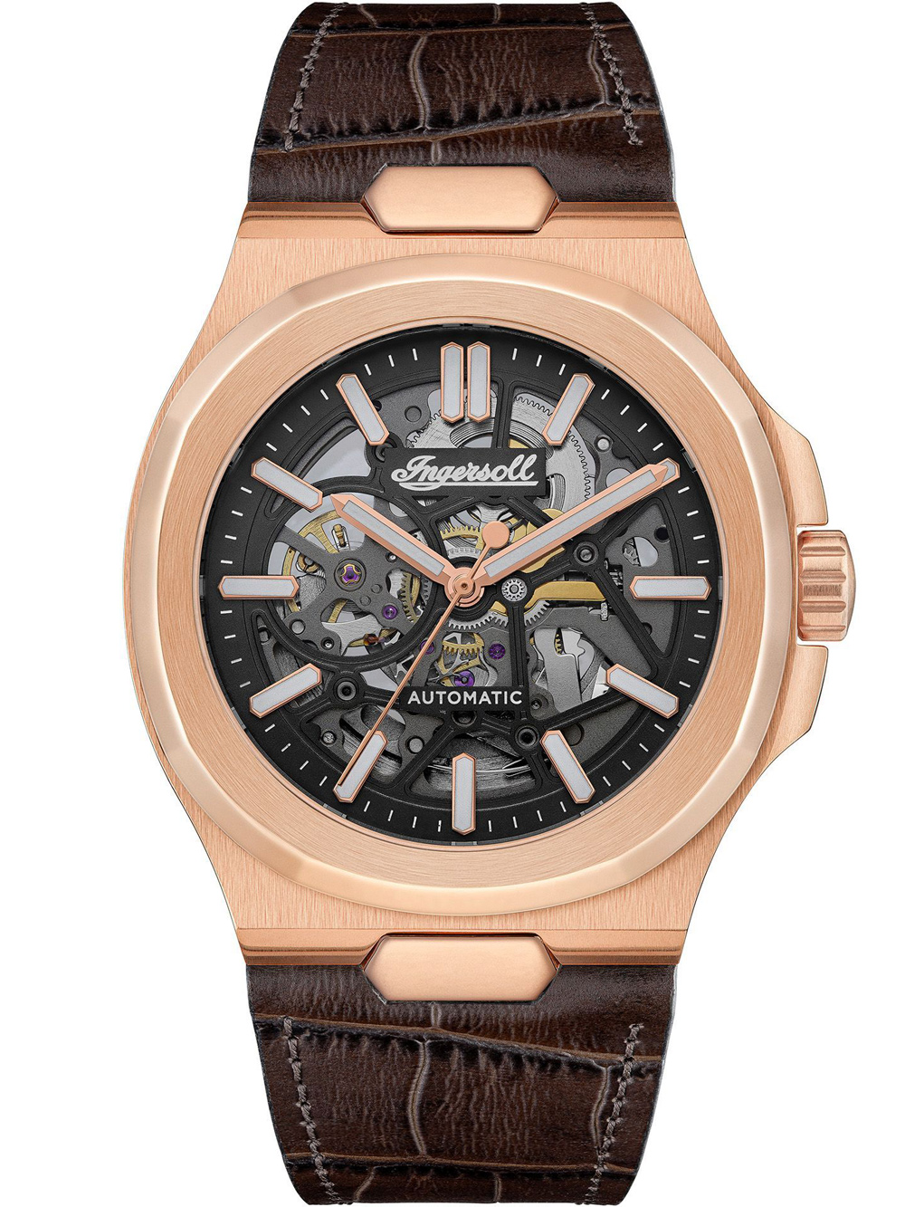 Ontdek de tijdloze elegantie van het Ingersoll I12505 Catalina automatisch herenhorloge, met een diameter van 44 mm, waterbestendigheid tot 5 ATM en een sophisticated rosé gouden kast en bruine leren band.