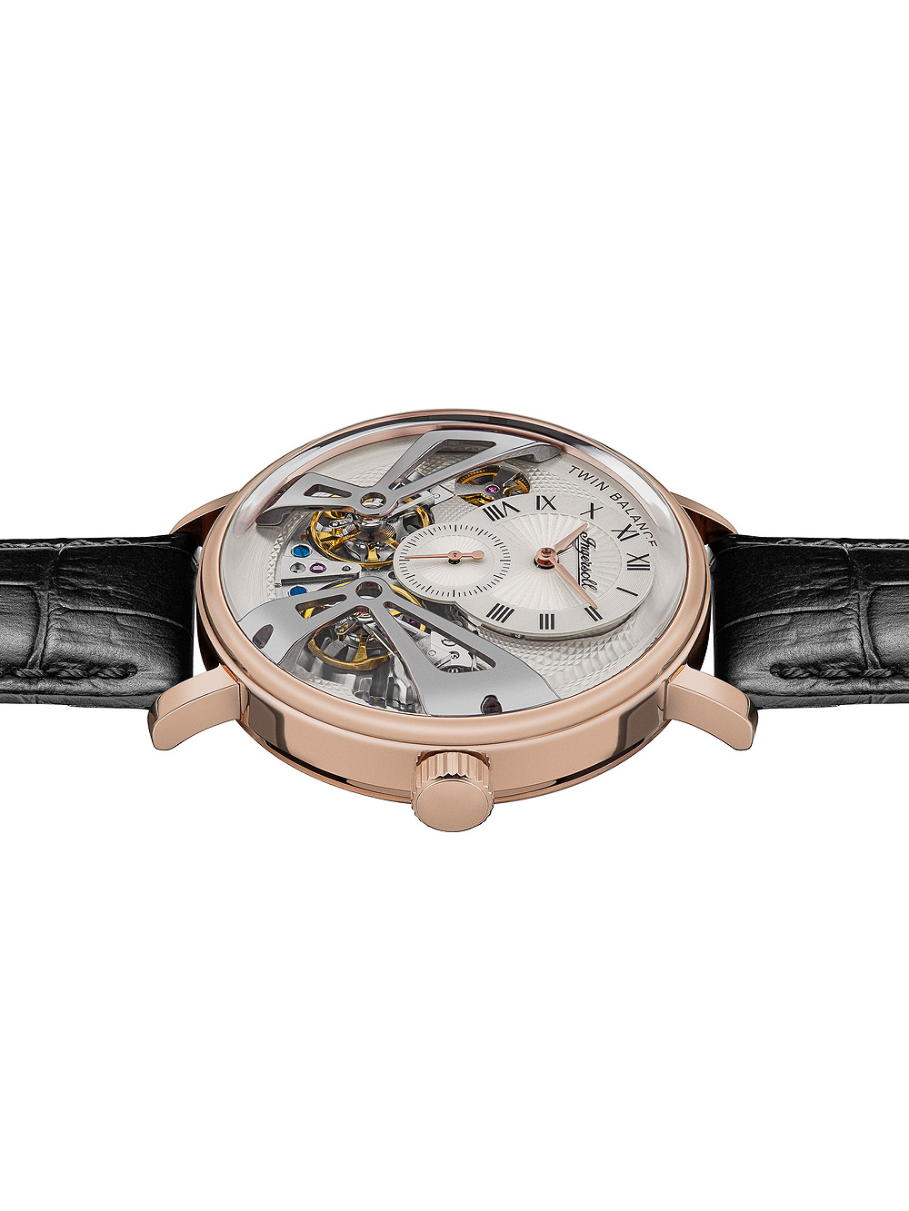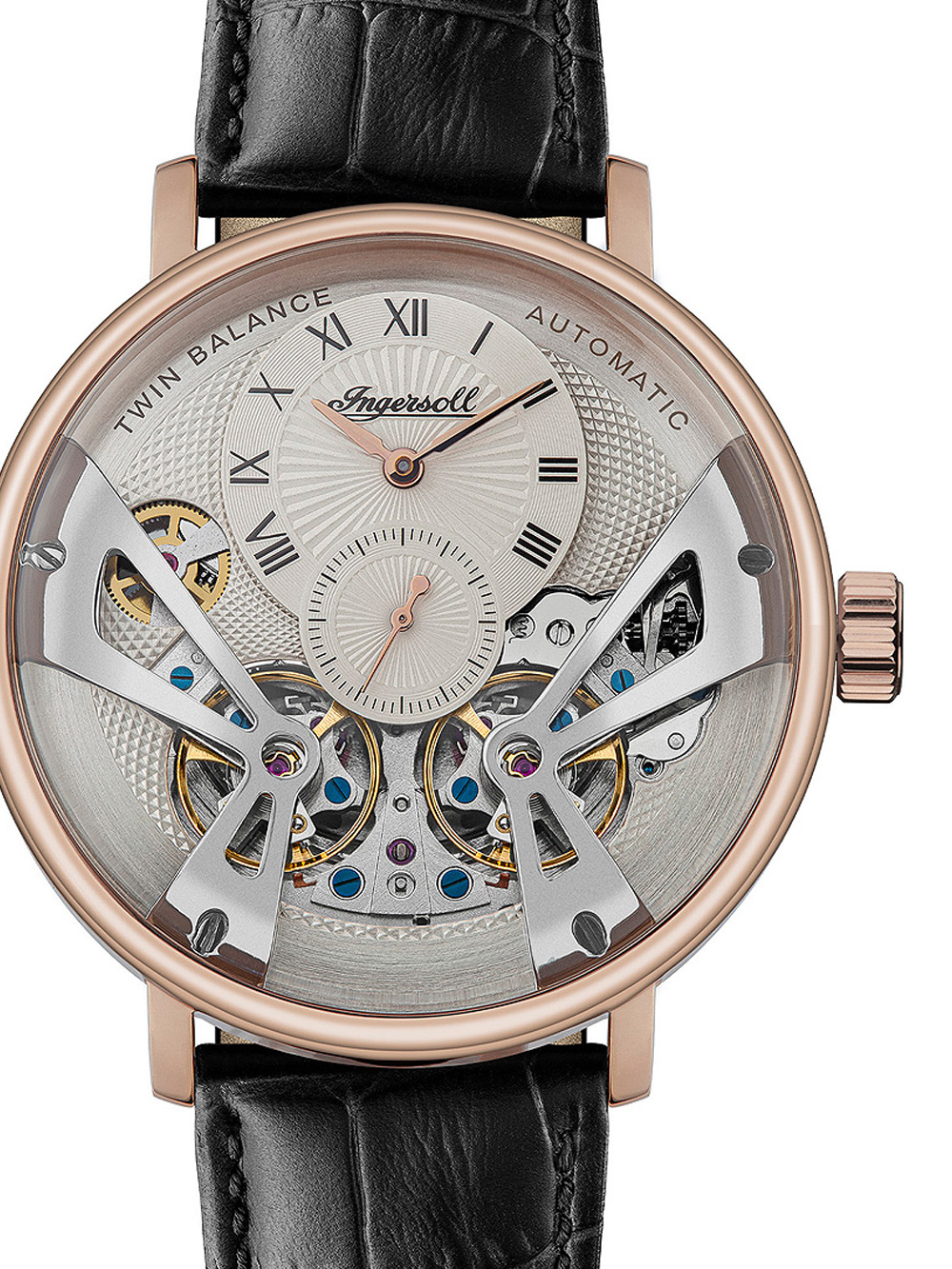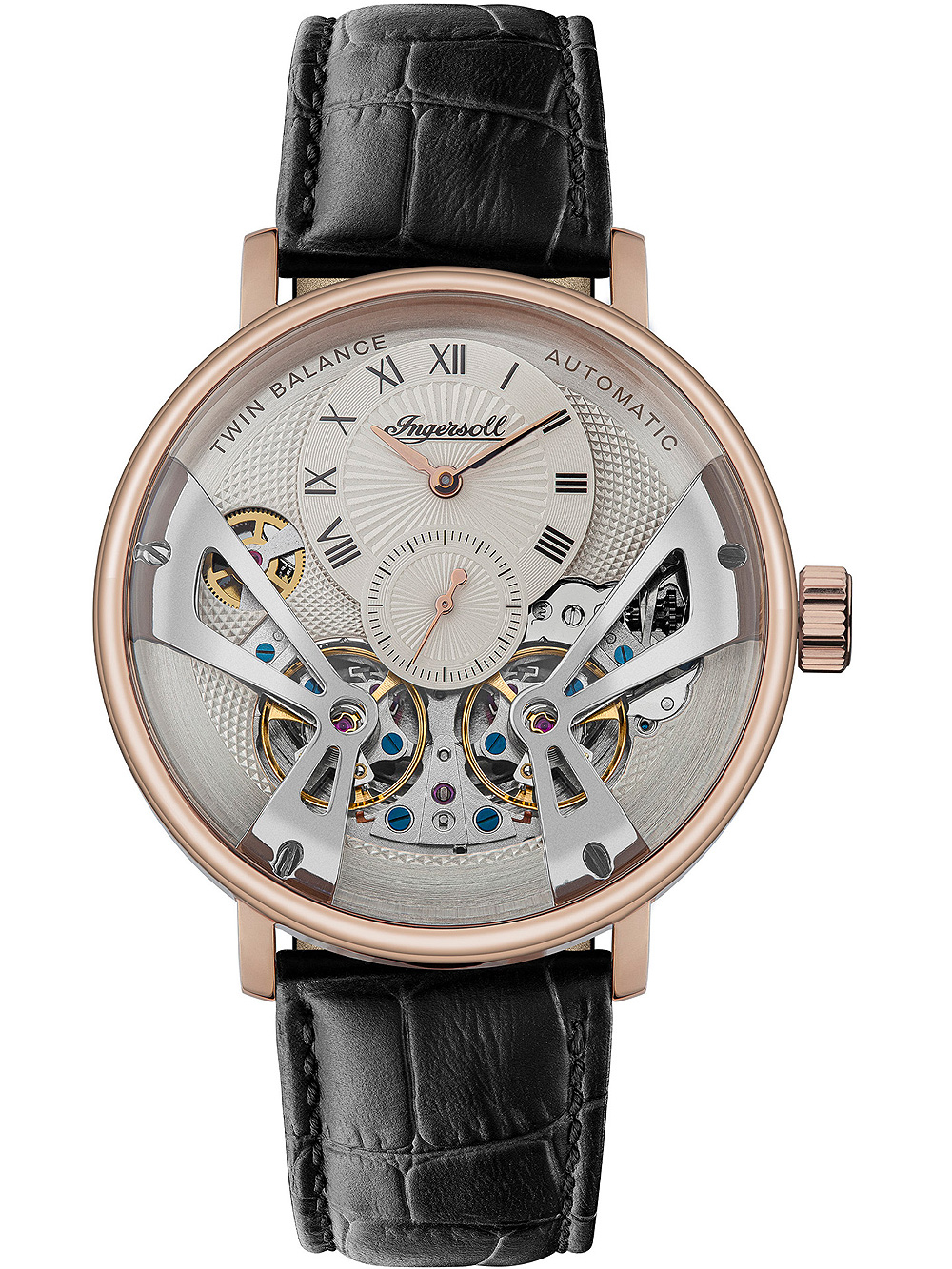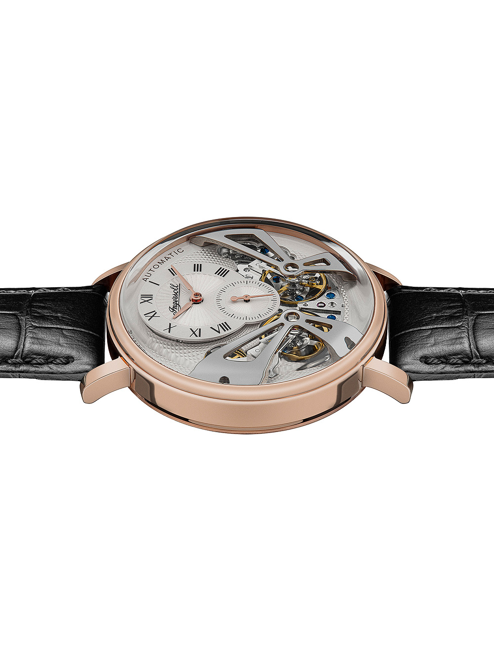 De Ingersoll I13101 De Tennessee automatische 46 mm 5ATM is een stijlvol polshorloge met roségouden details en een leren band, perfect voor de moderne man die houdt van klassieke horloges.