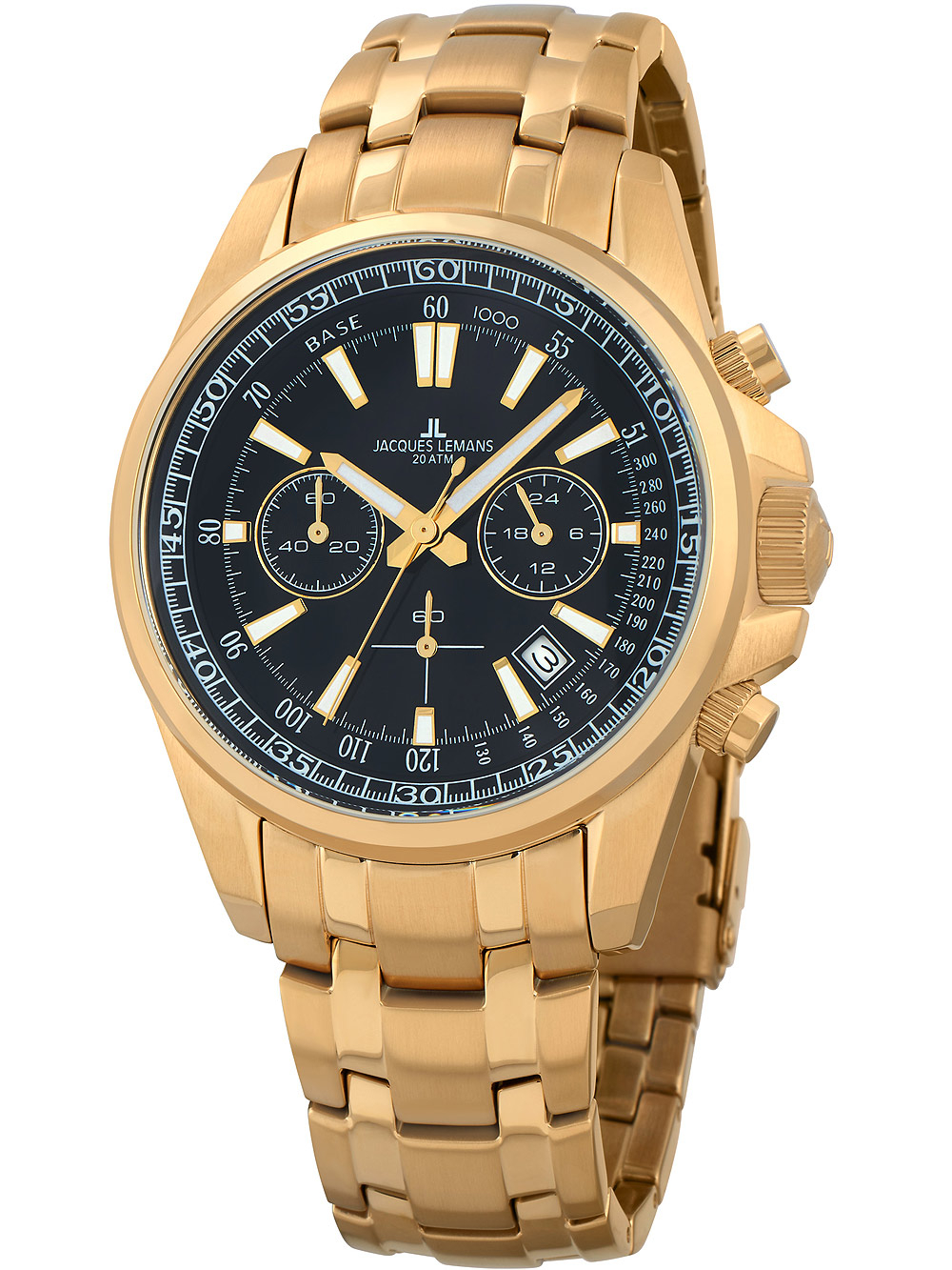 Het Jacques Lemans 1-2117M Liverpool chronograaf polshorloge is een stijlvol en sportief horloge voor heren, met een zwarte wijzerplaat, gouden kast en band van roestvrij staal, waterbestendig tot 20 ATM en voorzien van handige functies zoals een chronograaf en datumweergave.