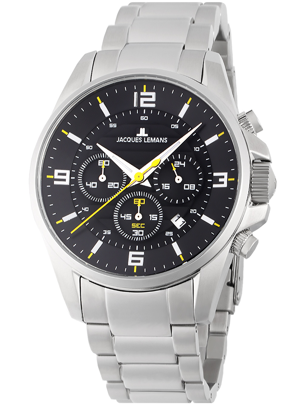 Het Jacques Lemans 1-2118D Liverpool chronograaf herenhorloge is een stijlvol en sportief polshorloge met een zwarte wijzerplaat, een 44 mm zilveren kast en een roestvrijstalen band, voorzien van functies zoals chronograaf, datumweergave en waterbestendigheid tot 10 ATM.