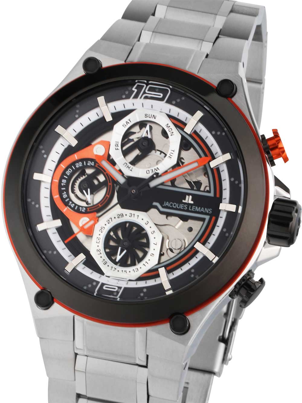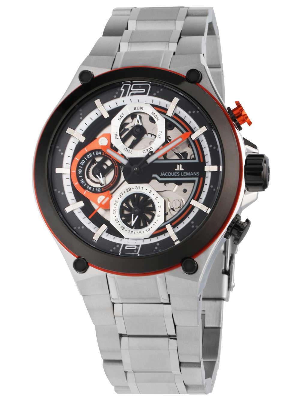 Met het multifunctionele Jacques Lemans 1-2150E Manchester herenhorloge van 43 mm, voorzien van een modebewuste zwarte, oranje en zilveren wijzerplaat en een waterbestendigheid van 10 ATM, ben je altijd bij de tijd en klaar voor elke sportieve uitdaging.