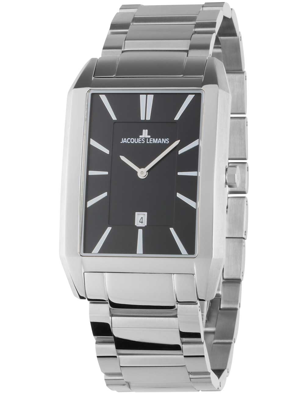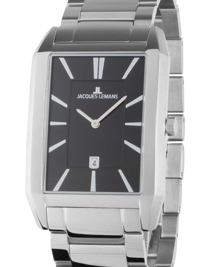 Het Jacques Lemans 1-2160H Torino vierkant herenhorloge is een tijdloos en stijlvol polshorloge met een zwarte wijzerplaat, een zilveren roestvrijstalen kast en band, en een waterbestendigheid van 5 ATM.