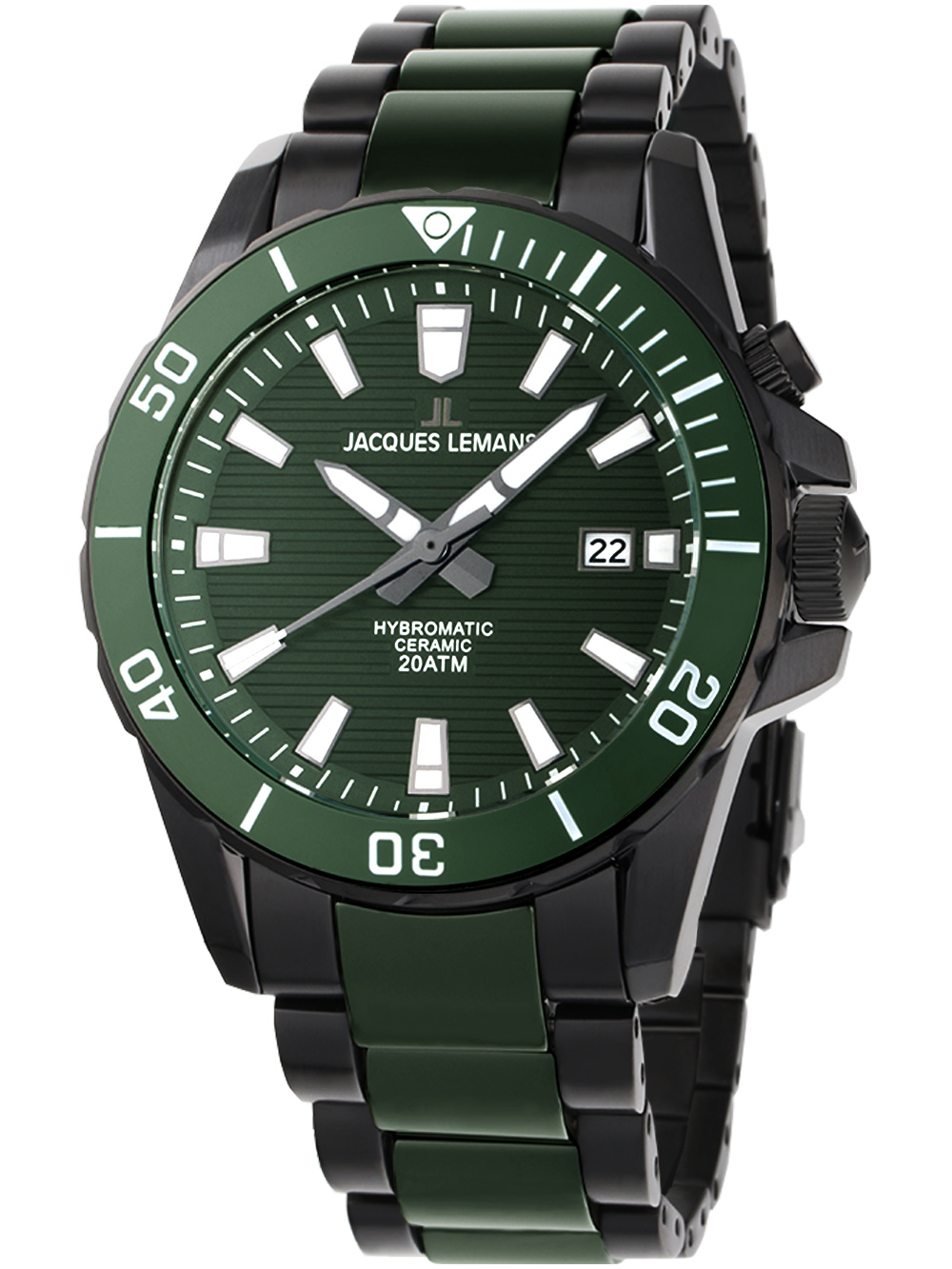 Omschrijving Het Jacques Lemans 1-2222F Hybromatic herenhorloge is een sportief horloge met een groene wijzerplaat, 20ATM waterbestendigheid en een modieuze combinatie van zwart en groen op de keramische en roestvrijstalen band.