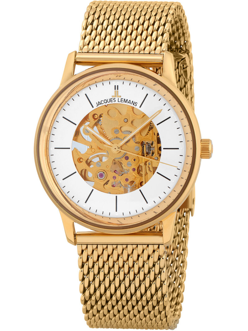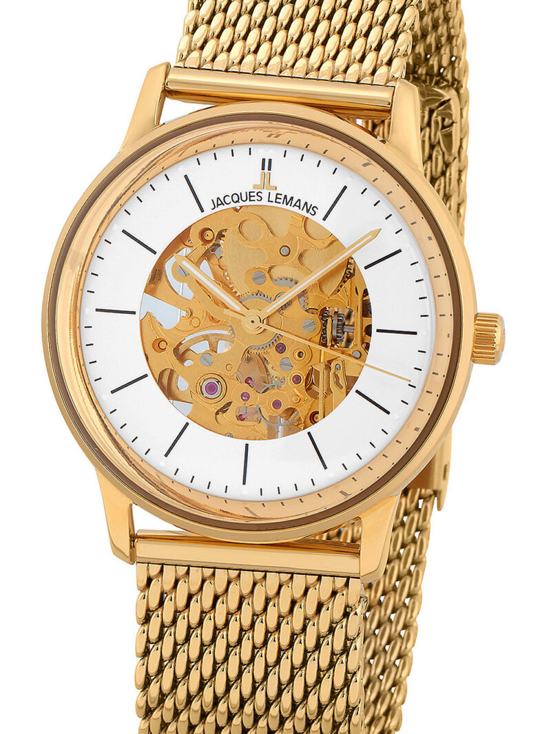 Het Jacques Lemans N-207ZE Retro Classic handopwindmechaniek unisex horloge is een elegant polshorloge met een gouden wijzerplaat en een matted en polished afwerking, waterbestendig tot 5 meter en voorzien van een stalen band en gespsluiting.
