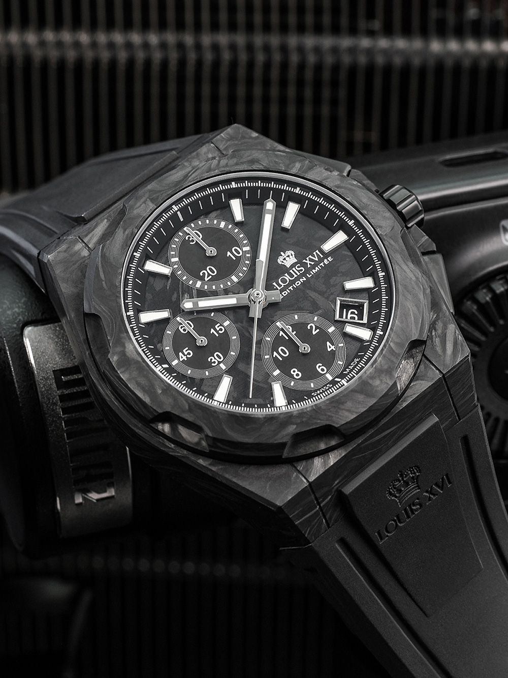 Ontdek de perfecte combinatie van klassiek en modern met dit automatische herenhorloge van Louis XVI, de LXVI1200 La Vauguyon chronograaf, met een tijdloze zwarte wijzerplaat, matzwarte carbon kast en een limited edition van slechts 1000 stuks.