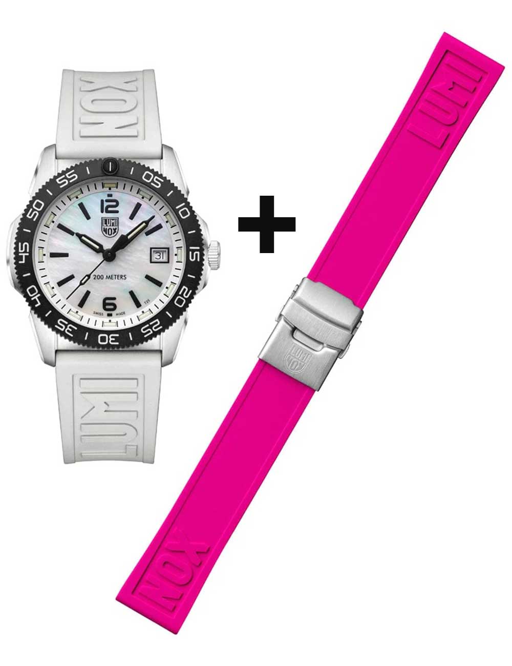 Het Luminox XS.3128M.SET Pacific Diver unisex horloge is een stijlvol en sportief accessoire met een moeder van parel en witte wijzerplaat, een draaibare bezel, een matzwarte kast van carbon en roestvrij staal, en een roze en witte rubberen band.