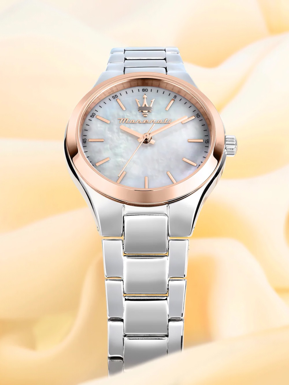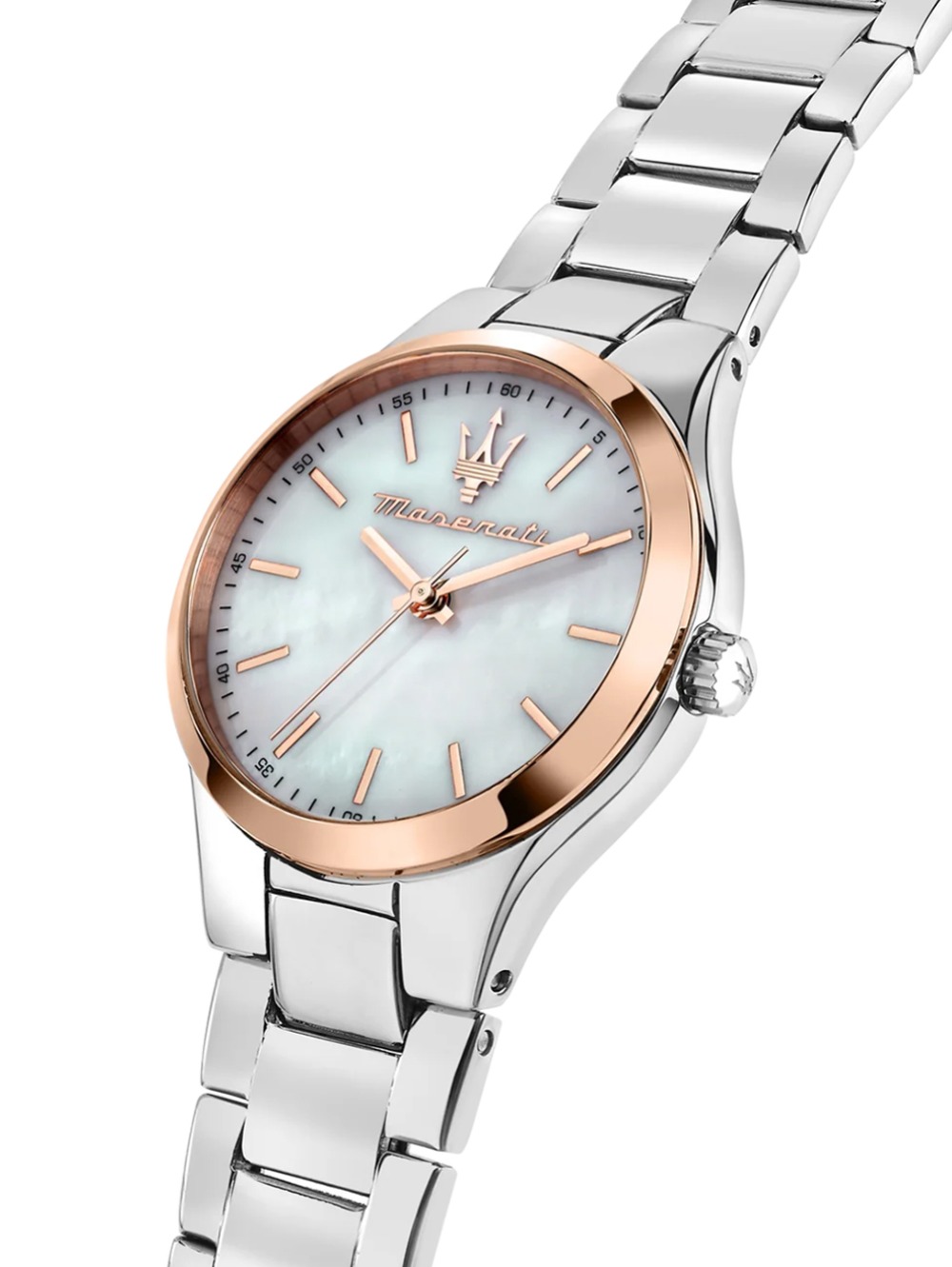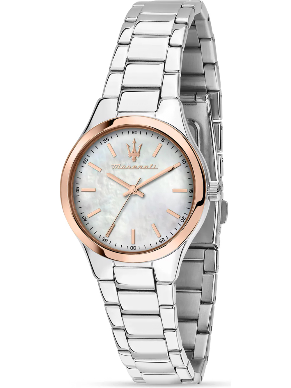Met dit elegante polshorloge van Maserati, model R8853151503 uit de Attrazione serie, ben je altijd bij de tijd dankzij de uur-, minuut- en secondeweergave en geniet je van een sophisticated look met het rosé gouden en zilveren design en de MOP witte wijzerplaat.