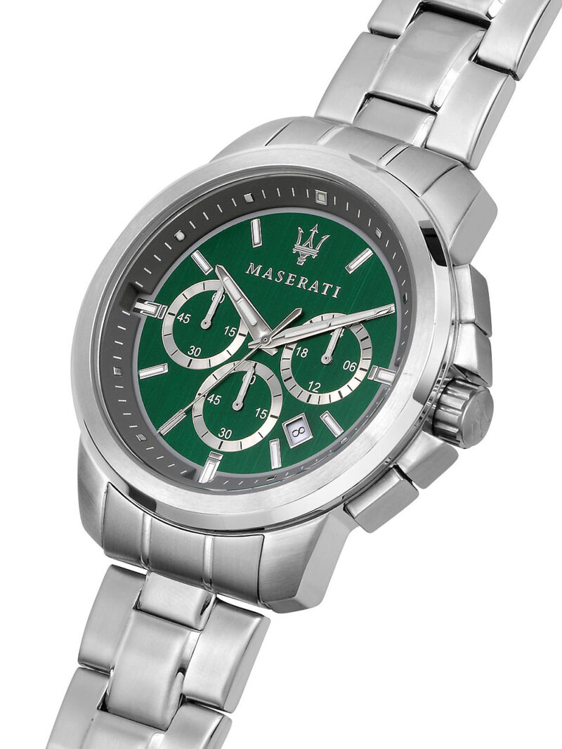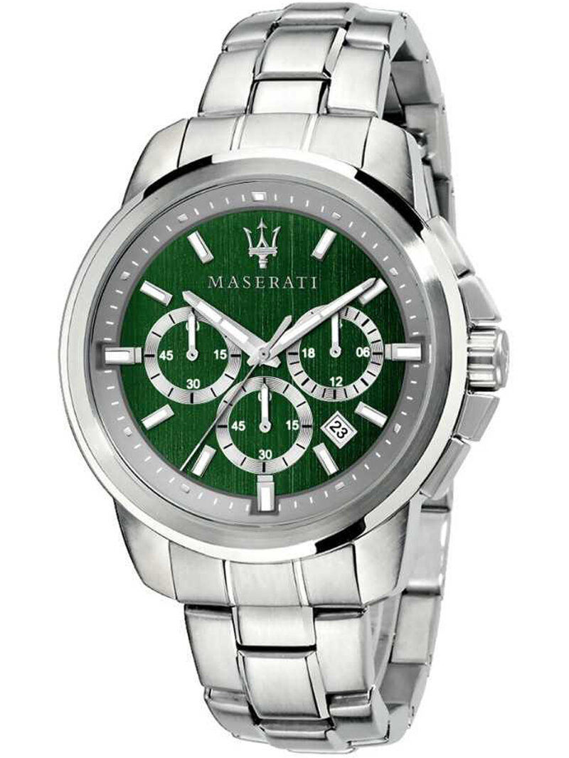Met dit elegante en sportieve Maserati R8873621017 Successo chrono polshorloge van 44 mm, voorzien van een groene wijzerplaat en een stevige roestvrijstalen band, ben je altijd op tijd én in stijl.