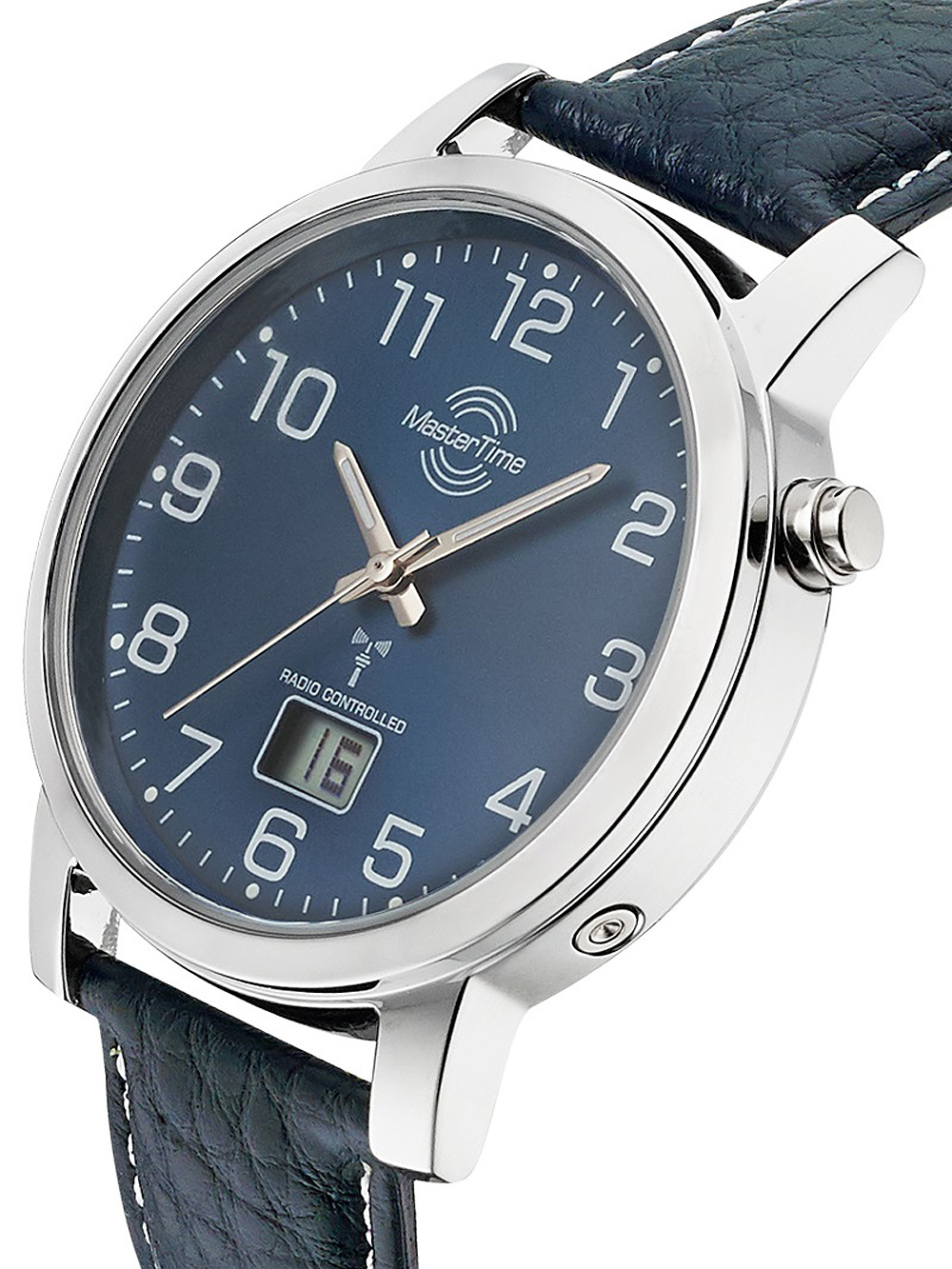 De Master Time MTGA-10493-32L is een stijlvol polshorloge voor heren uit de Funk Basic Series, met radiogestuurde tijdweergave, datum en een blauwe wijzerplaat, gemaakt van hoogwaardige materialen en waterbestendig tot 3 ATM.