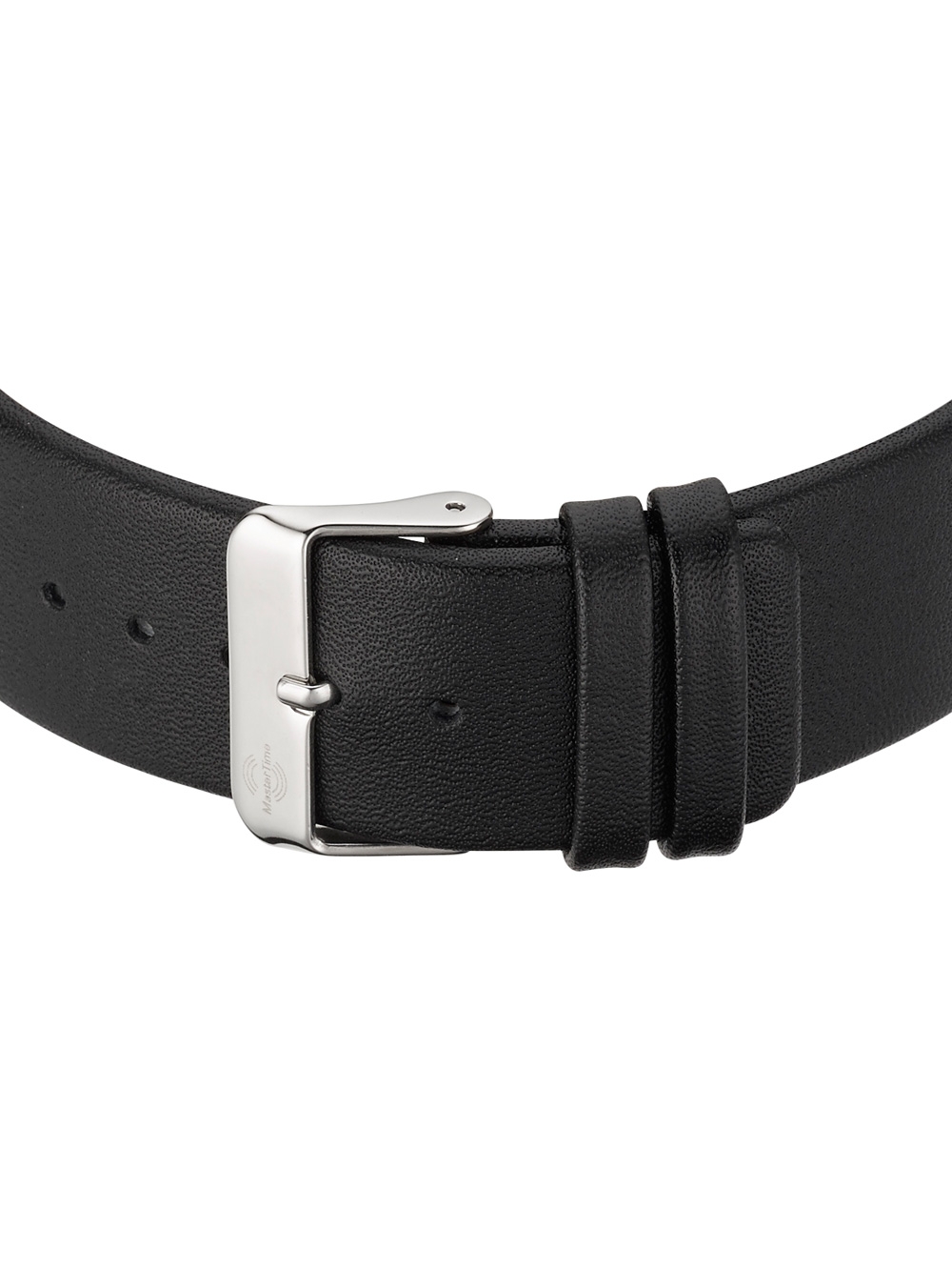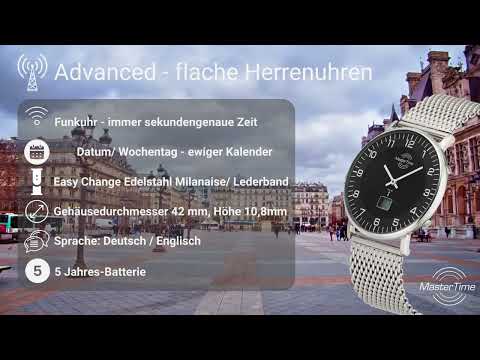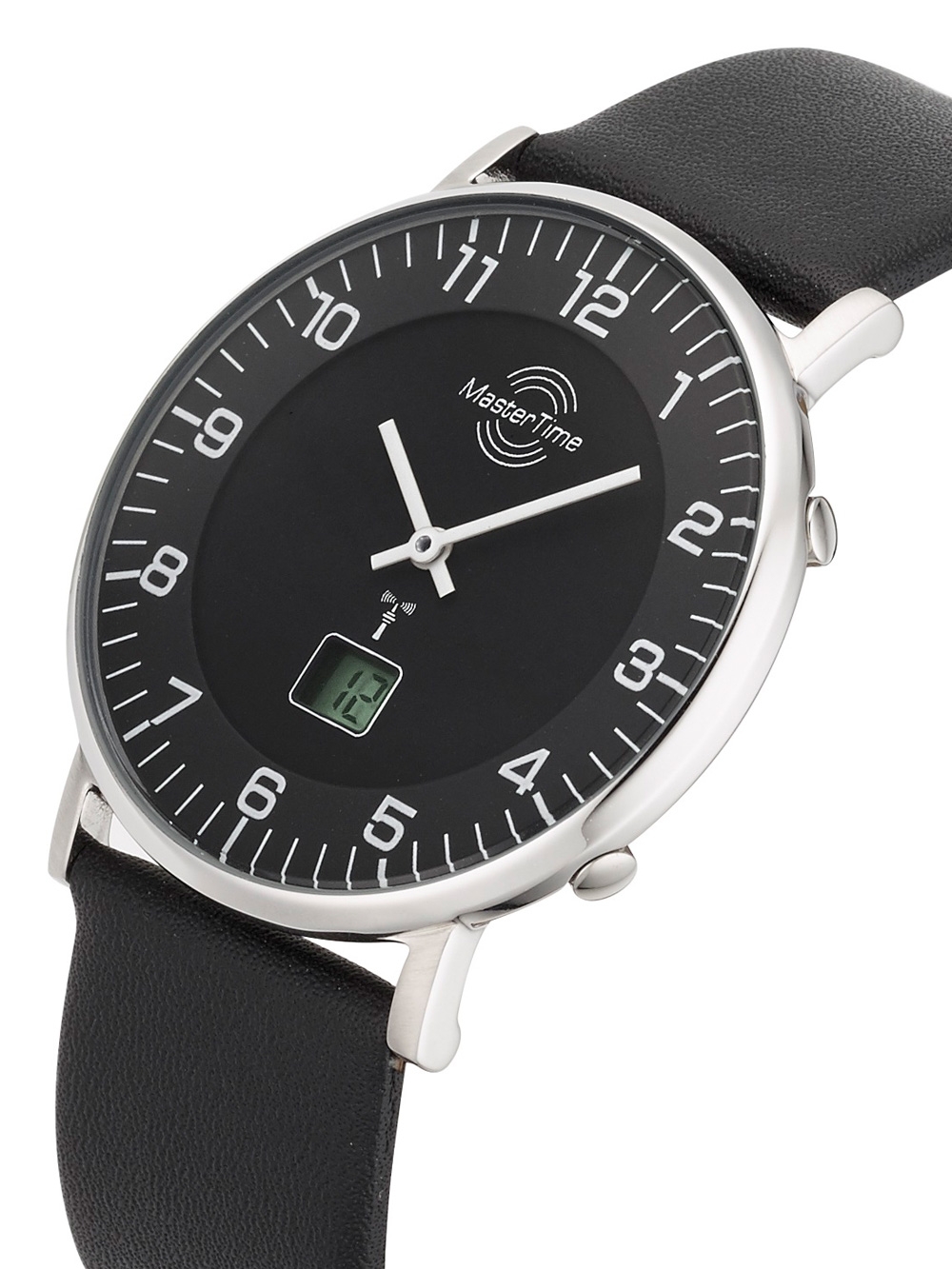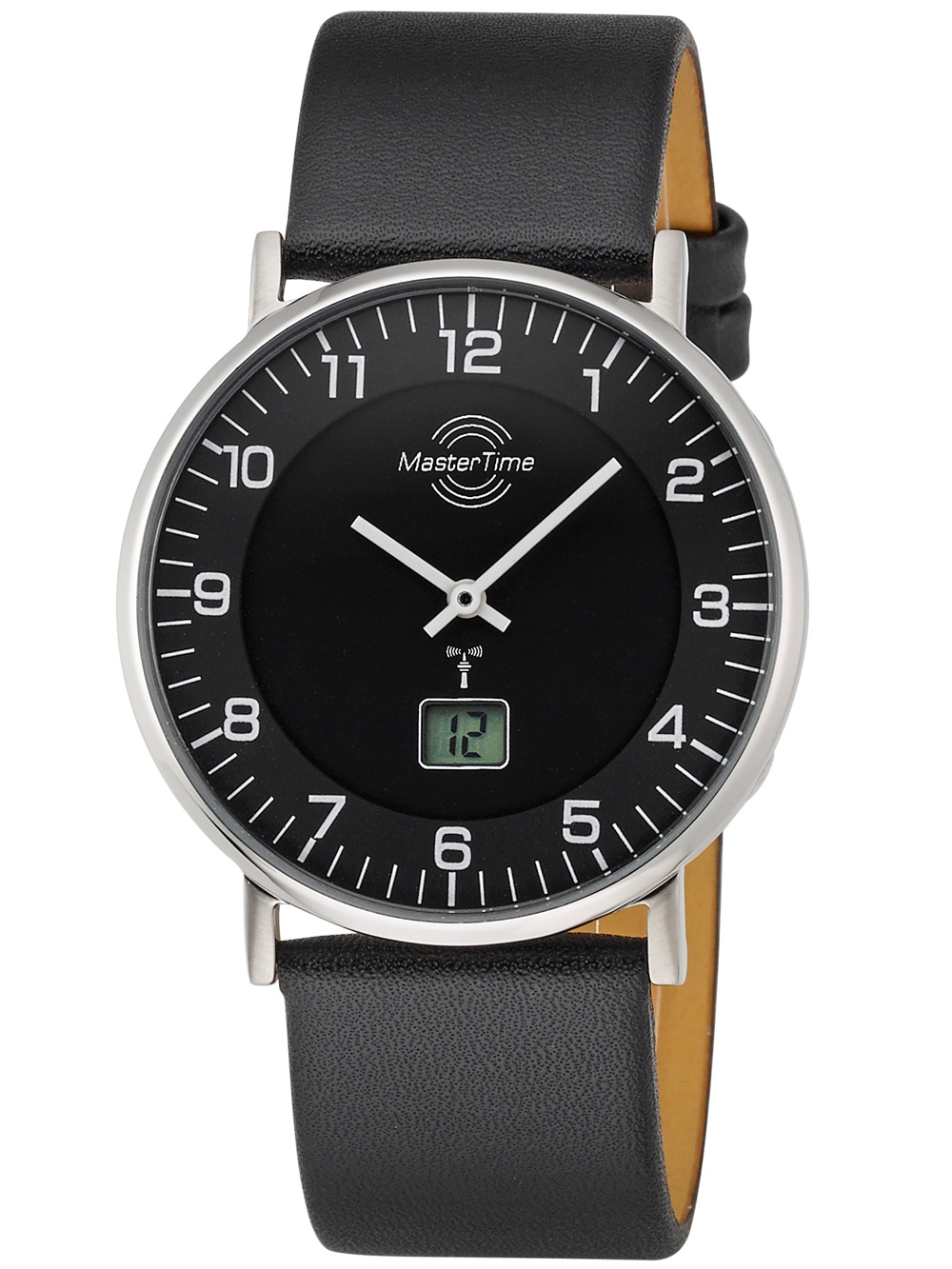Het Master Time MTGS-10560-22L polshorloge uit de geavanceerde serie voor heren is een radiogestuurd horloge van 40 mm met een klassieke uitstraling, voorzien van een zwarte wijzerplaat en een duurzame kalfsleren band.
