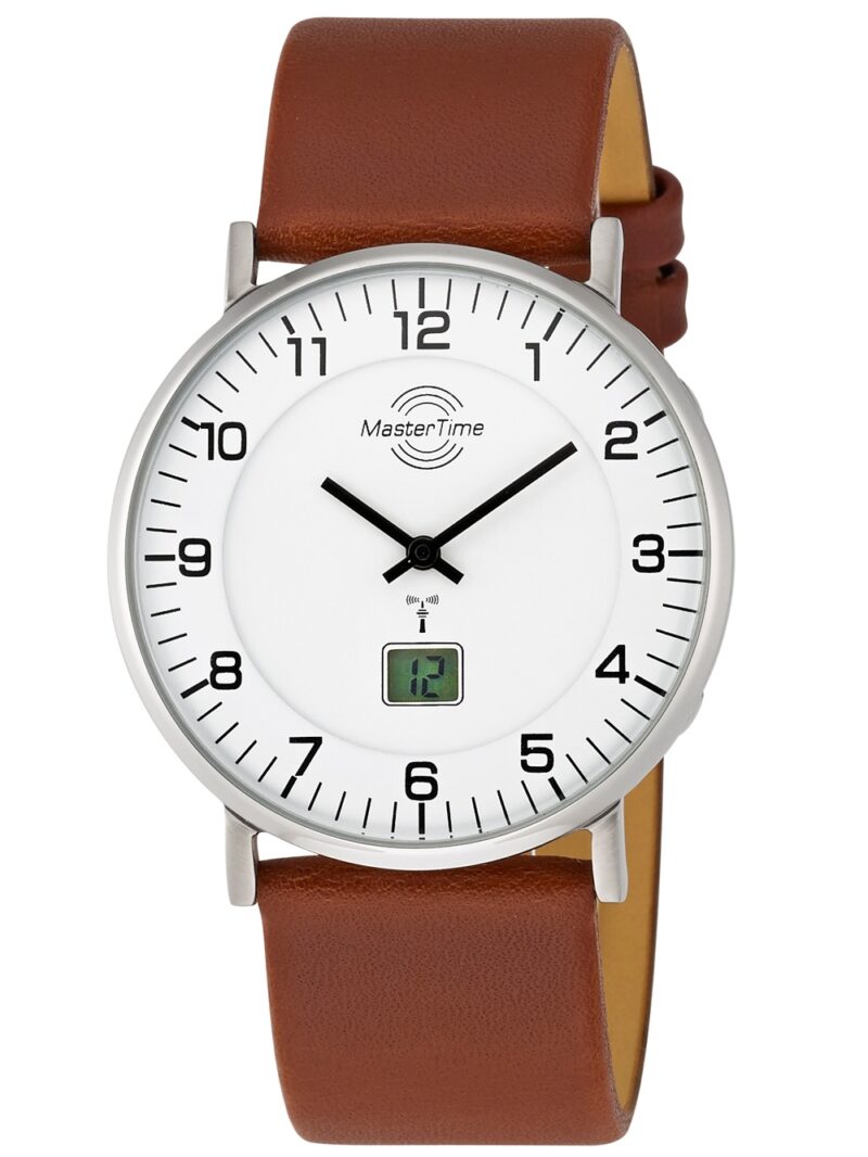Ga voor stijl en precisie met het Master Time MTGS-10561-12L radiogestuurde polshorloge uit de geavanceerde serie, met een witte wijzerplaat, analoge en digitale display en een bruine leren band.