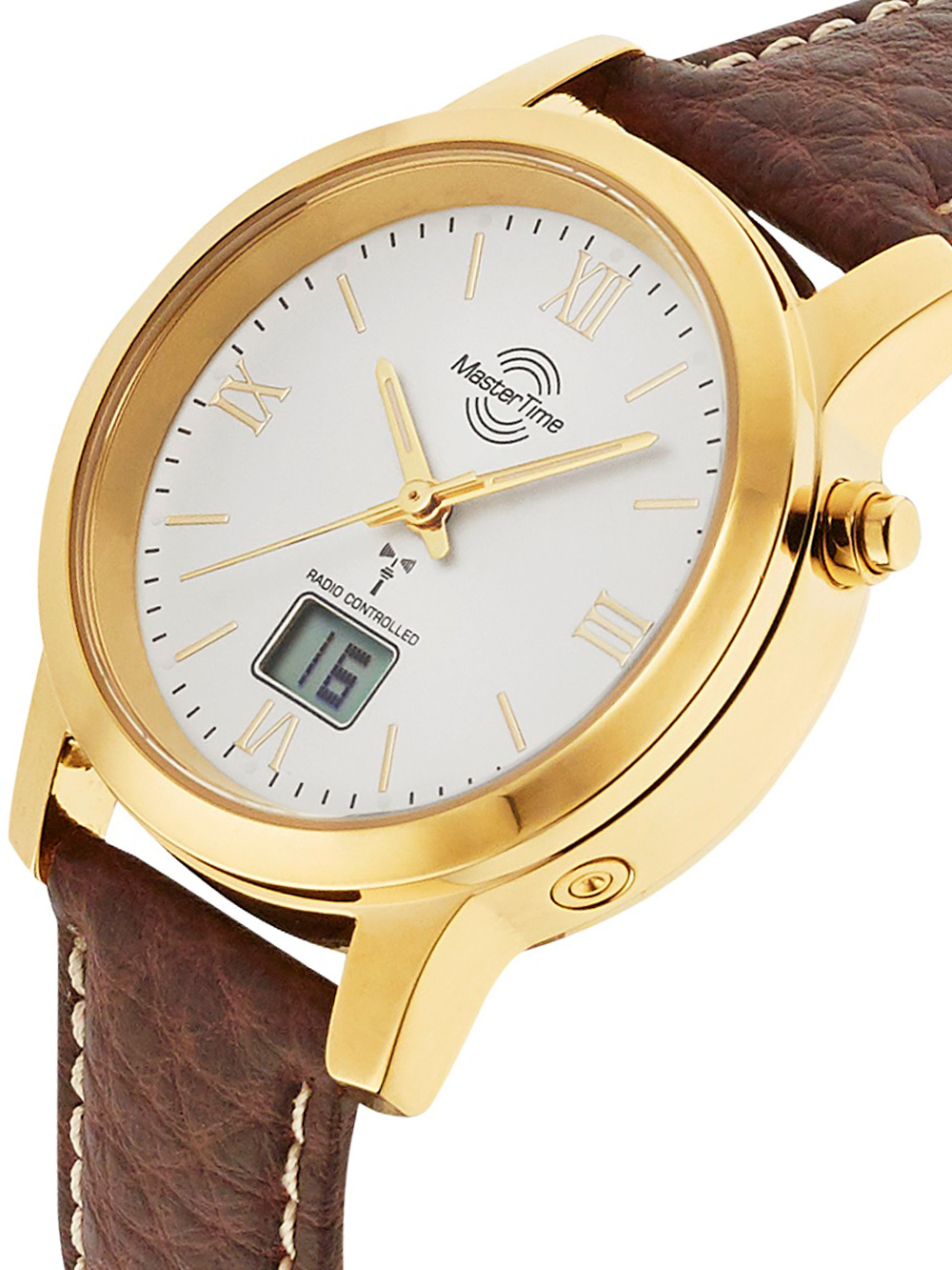 Omschrijving Stijlvol en nauwkeurig, dit gouden dames polshorloge van Master Time uit de Funk Basic Series met radiogestuurde functies en een leren band is een must-have voor elke klassieke look.