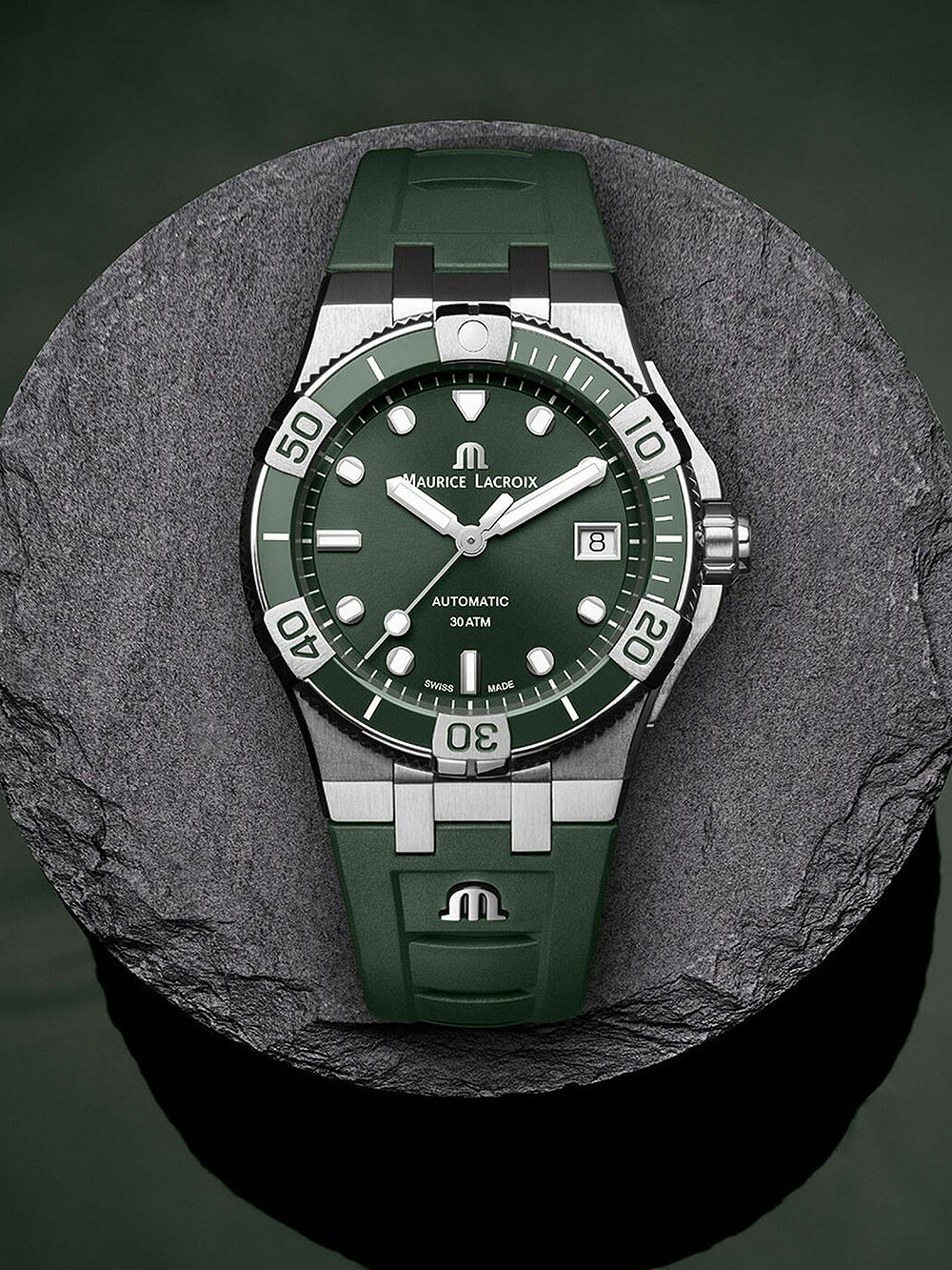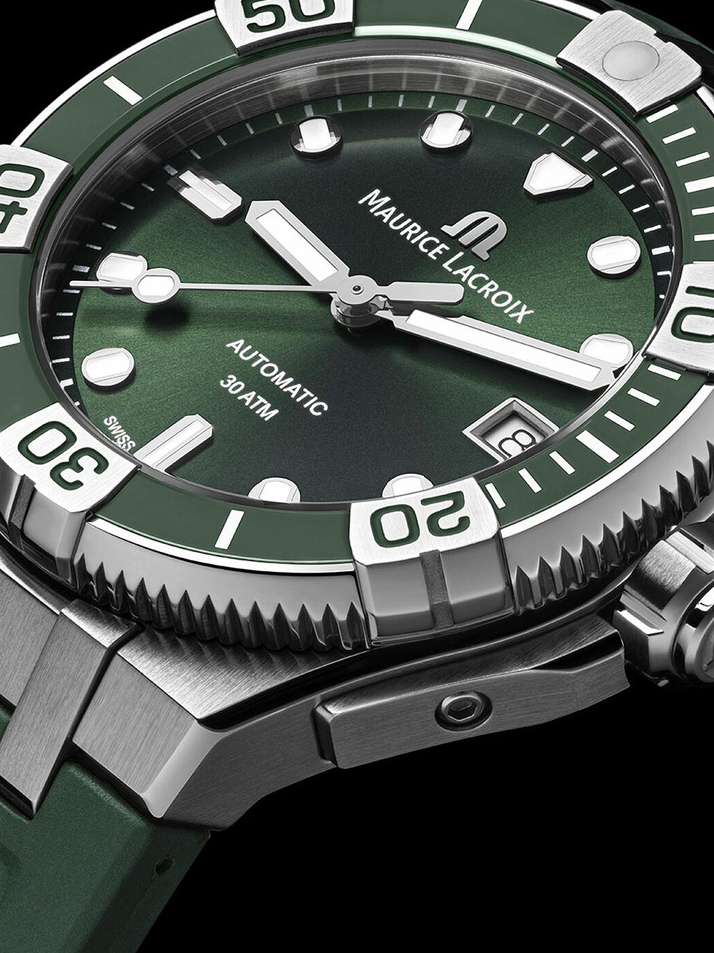 Het hippe en sportieve Maurice Lacroix AI6057-SSL5F-630-D Aikon automatisch venturer herenhorloge van 38 mm met groene wijzerplaat, Swiss Made ML115 automatisch uurwerk en waterbestendigheid tot 30 ATM is een must-have voor de moderne man.