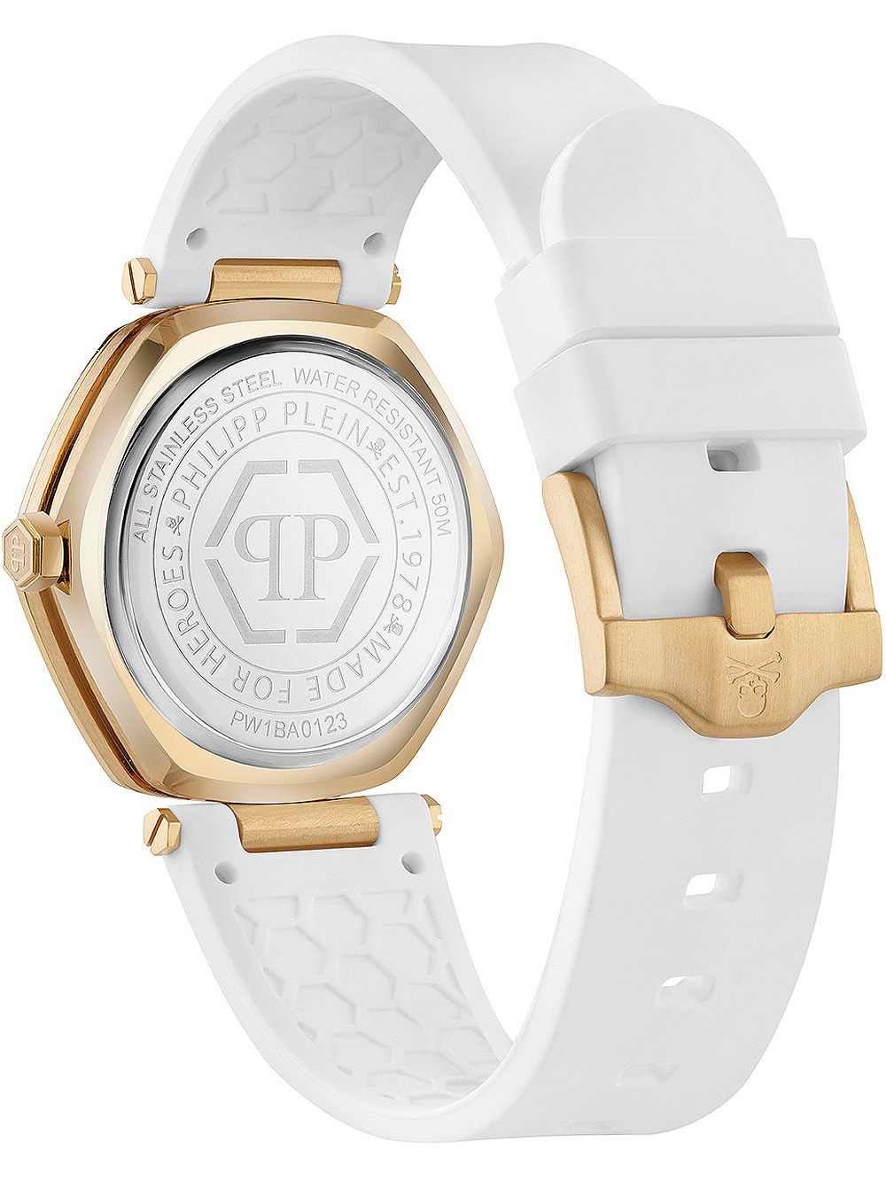 Omschrijving Maak een statement met het elegante en trendy Philipp Plein PW1BA0123 Hexagon dameshorloge, met een zilveren wijzerplaat en gouden kast, waterbestendig tot 5 ATM en een comfortabele witte siliconennn band.