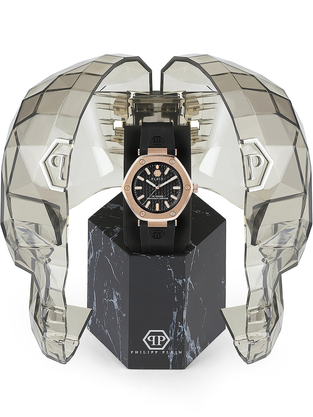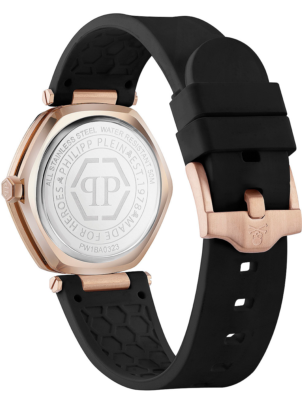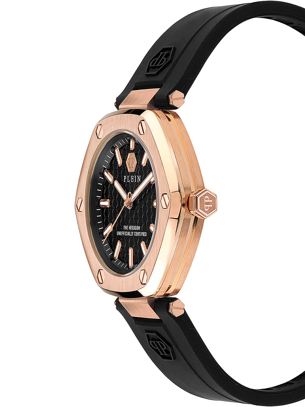 Laat je verleiden door de fashionable en trendy uitstraling van het Philipp Plein Hexagon dameshorloge, met een rosé gouden kast, zwarte wijzerplaat en comfortabele zwarte siliconennn band.