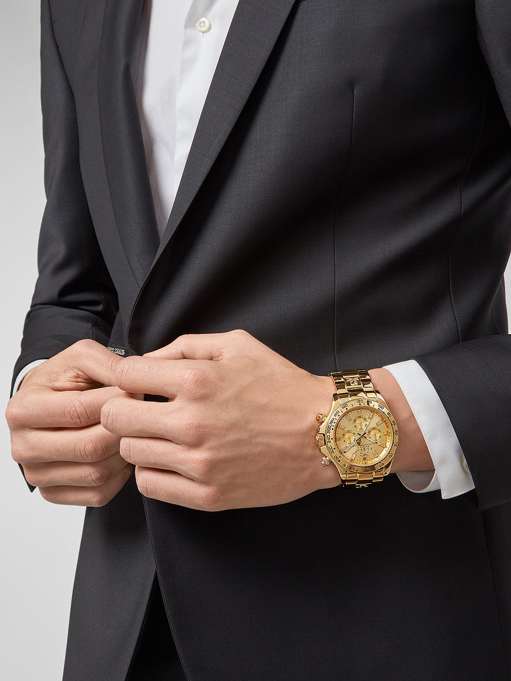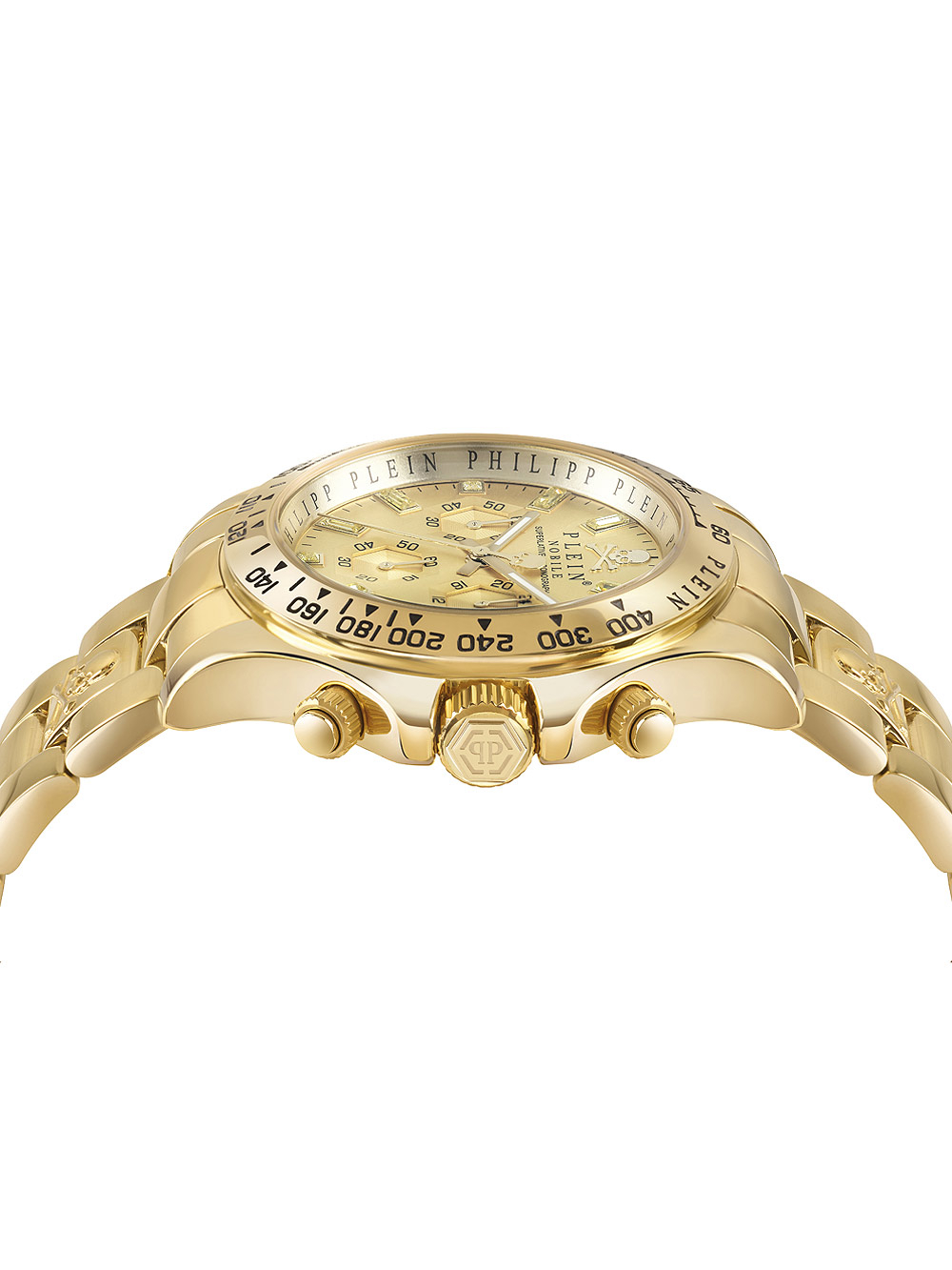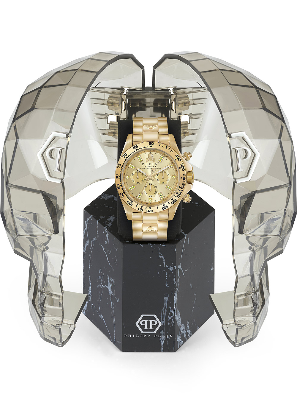 Met dit exquise Philipp Plein PWCAA1121 Nobile Wonder chronograaf herenhorloge van 43 mm, voorzien van gouden wijzerplaat en Swarovski details, ben je altijd bij de tijd en straal je pure luxe uit.