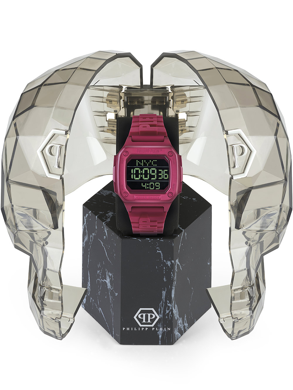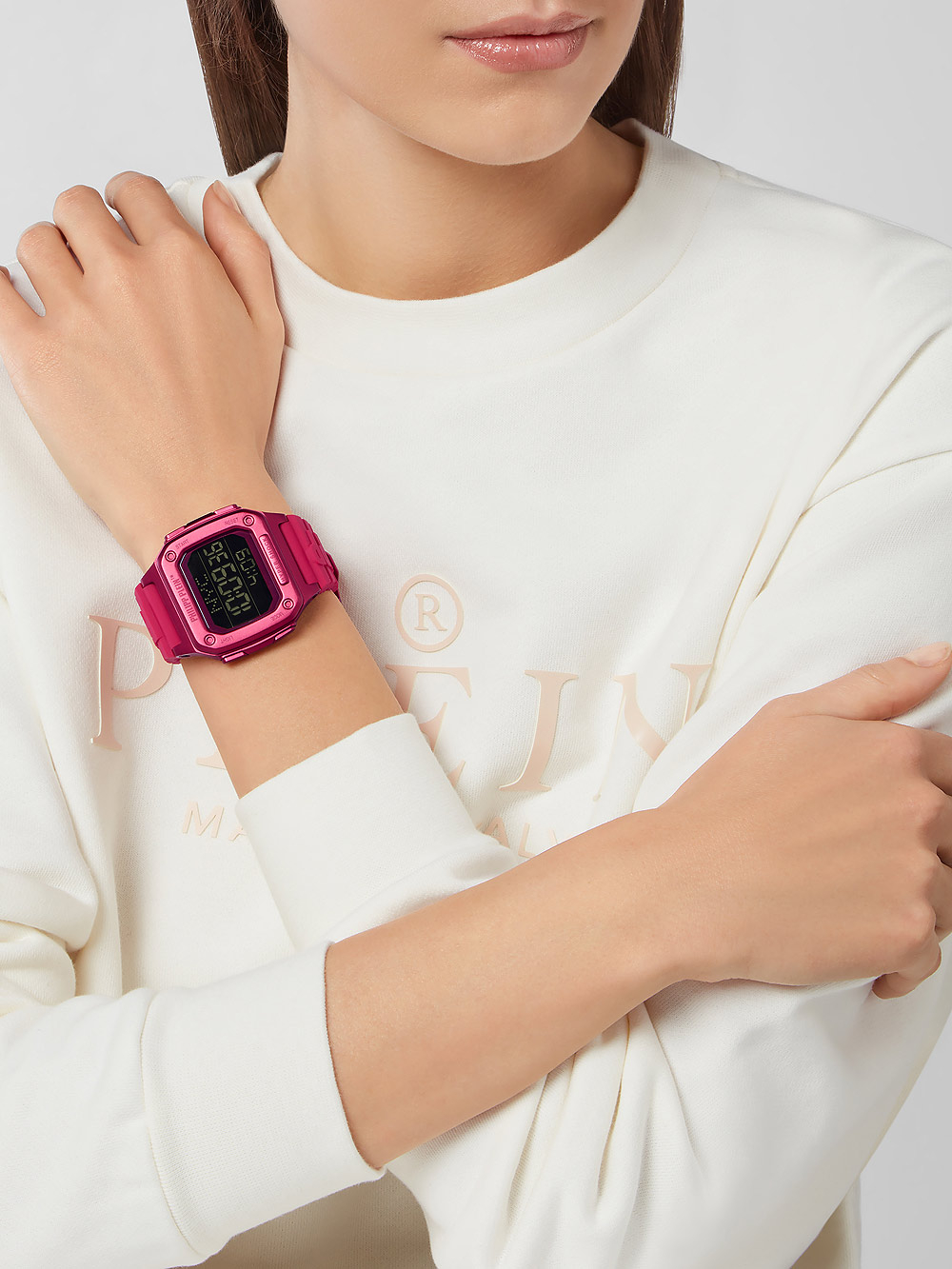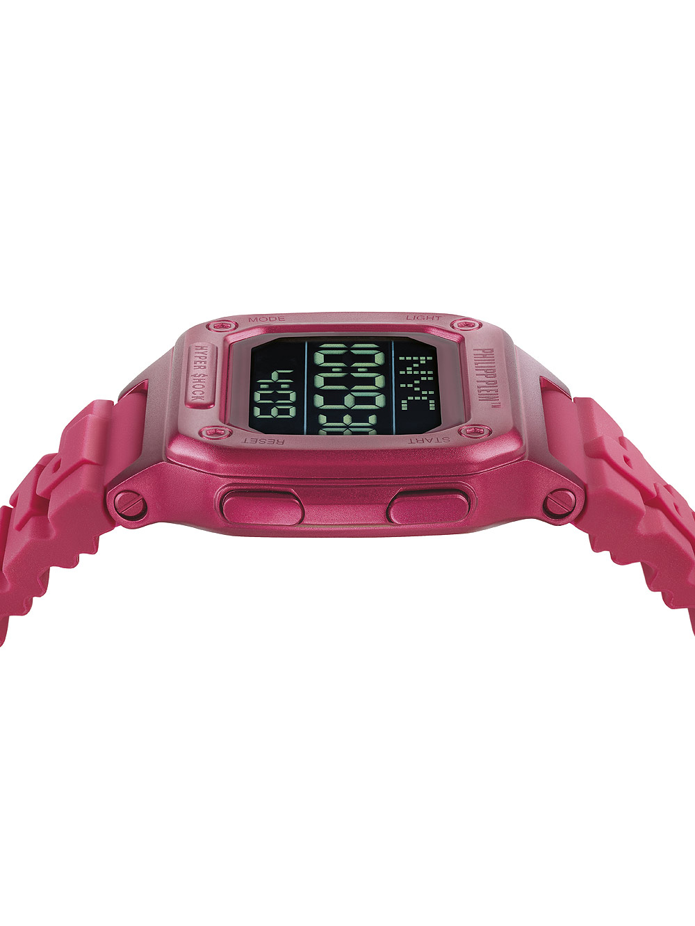 Het Philipp Plein PWHAA0121 HYPER $PORT polshorloge is een stoer en sportief unisex horloge van 44mm met alarm, datum, dag, uur, minuut, seconde, stopwatch, timer en wereldtijd functies, een matzwarte digitale display, waterbestendig tot 5 ATM, een vaste bezel, rode kast van roestvrij staal, gehard mineraalglas, achtergrondverlichting en een rode siliconennn band met gespsluiting.