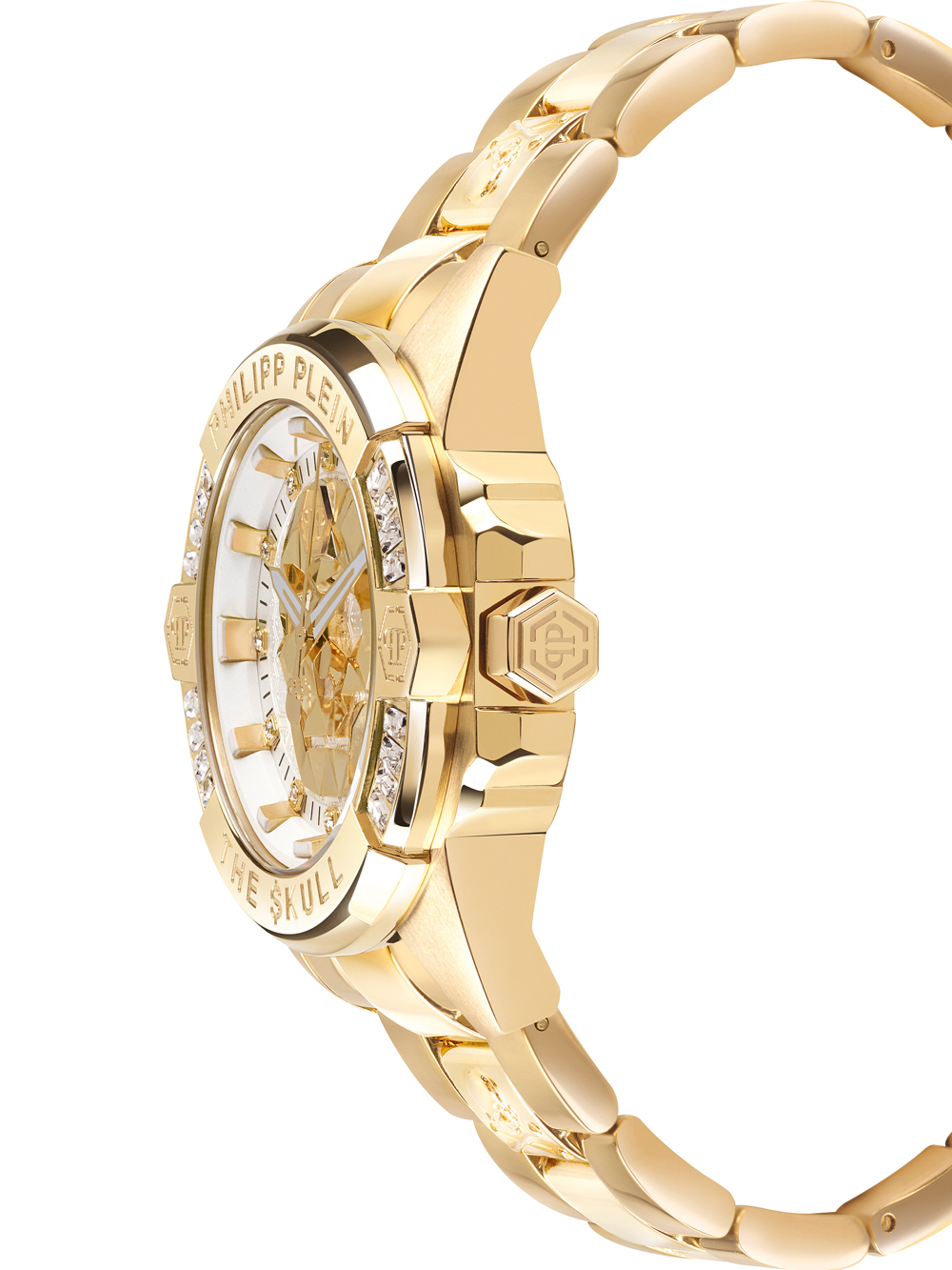 Dit fashionable Philipp Plein PWNAA0722 polshorloge uit de The $kull serie is een unisex horloge van 41 mm met een zilveren wijzerplaat, gouden kast en een matten en gepolijste afwerking, voorzien van een Miyota 203A quartz uurwerk en waterbestendig tot 5 ATM.