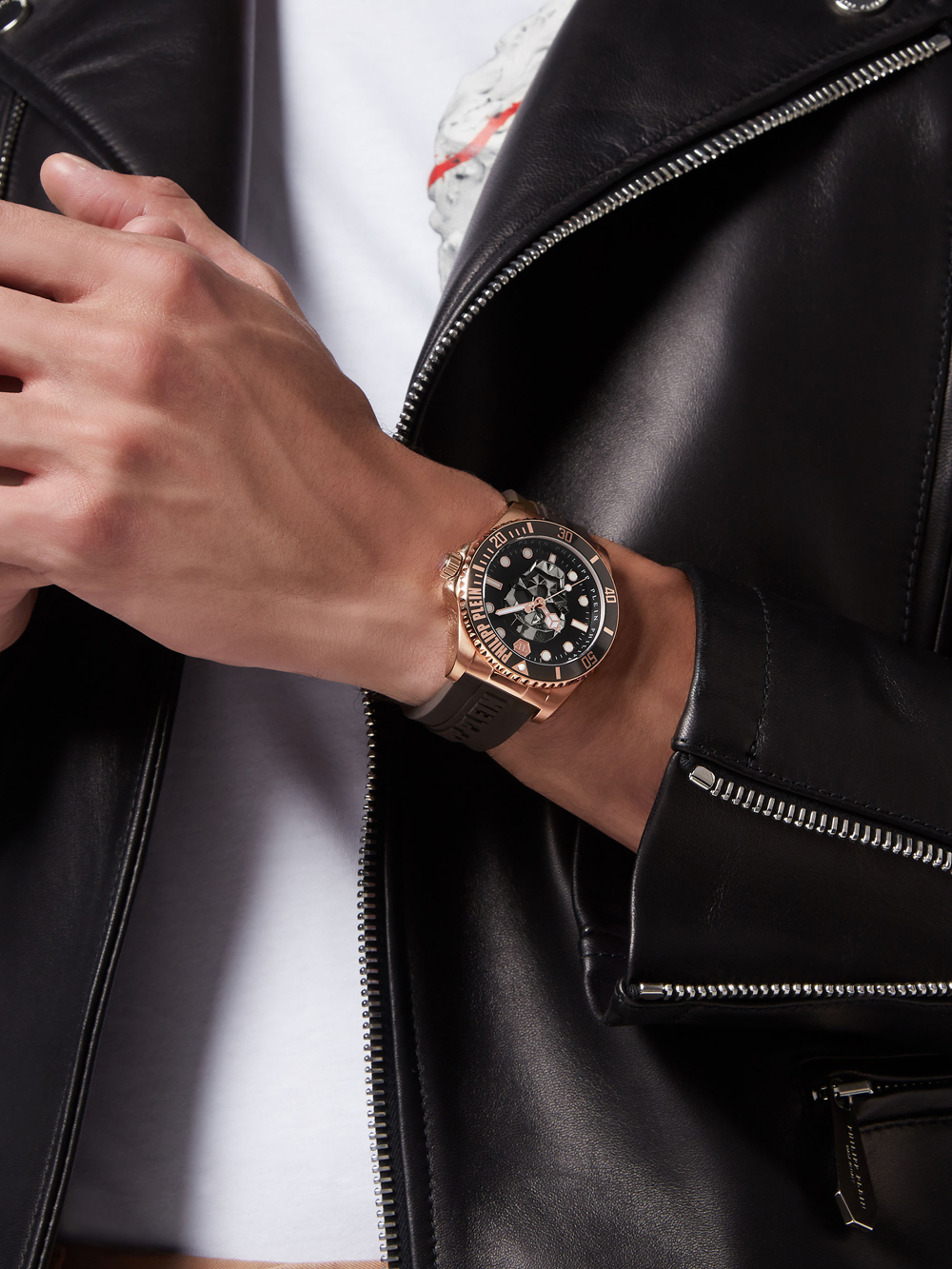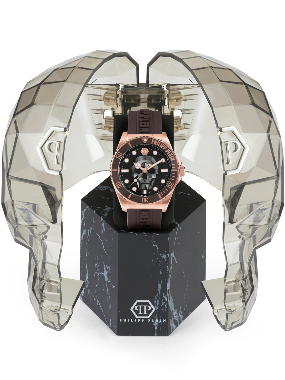 Het Philipp Plein PWOAA0322 De $kull Duiker 44mm 10ATM polshorloge is een stijlvol en sportief horloge met een rosé gouden kast, zwarte wijzerplaat en bruine siliconennn band, geschikt voor mannen met een maximaal polsomtrek van 220mm.